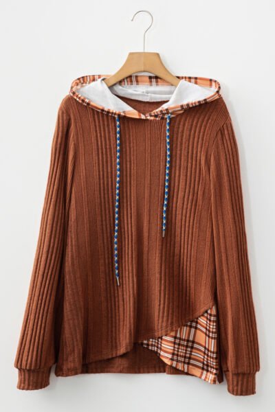 Chestnut Plaid Patchwork Ribbed Knit Drawstring Hooded Top