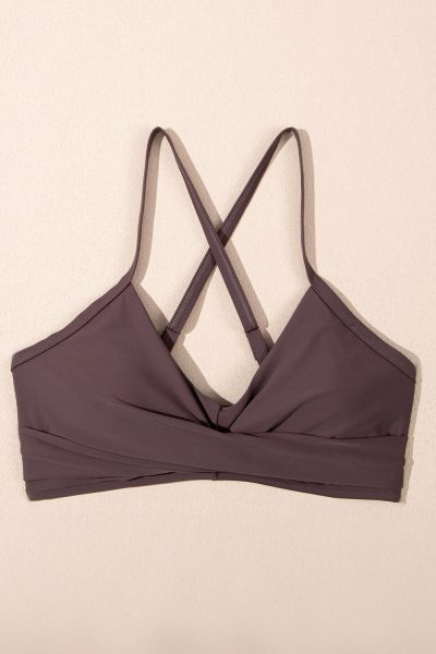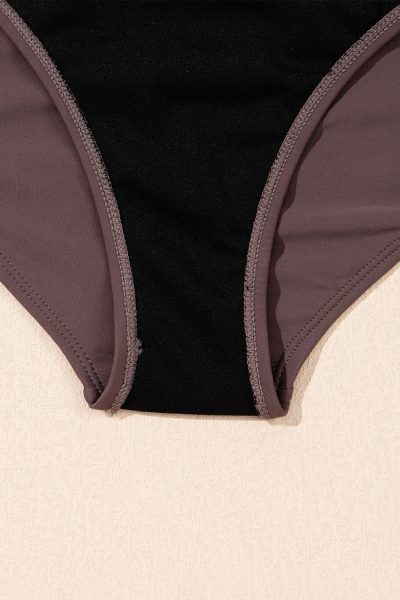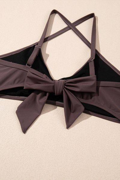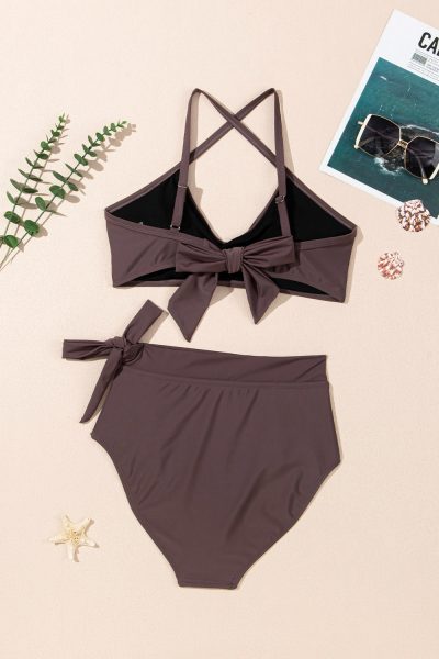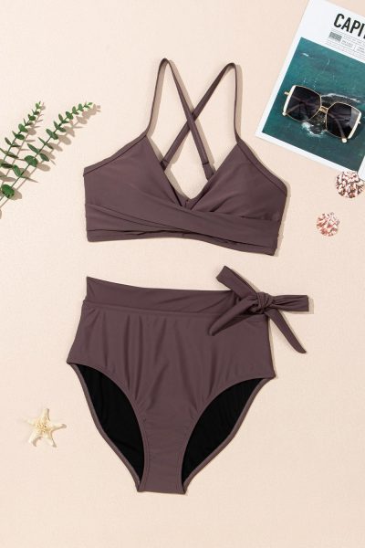 Chicory Coffee Crossed Straps Twisted Tropical Print Knot Side High Waist Bottom 2pcs Tummy Control Swimsuit