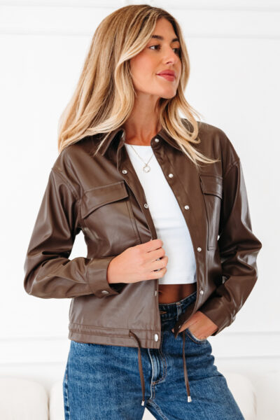 Chicory Coffee Double Flap Pocket Drawstring Hem Leather Jacket