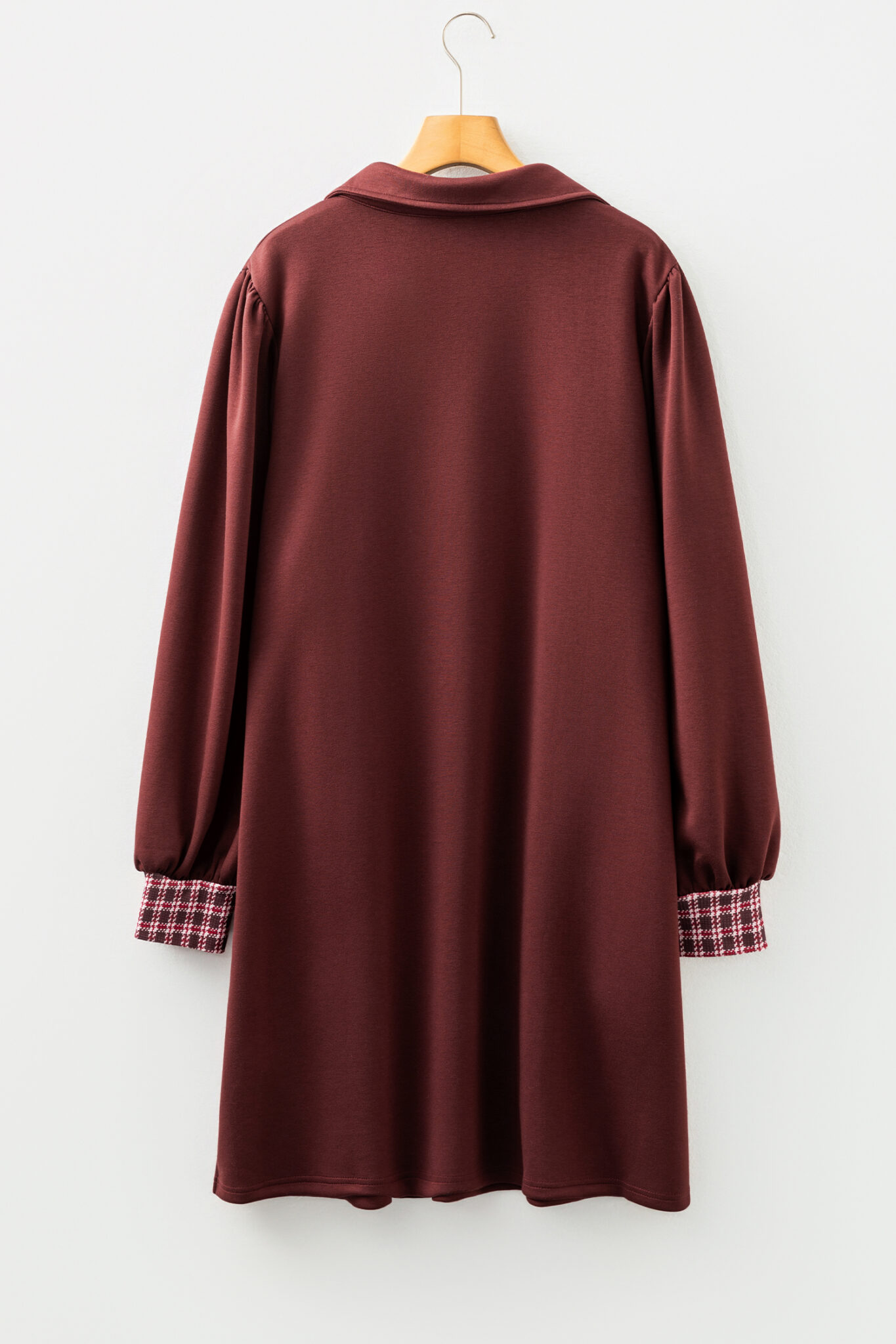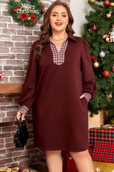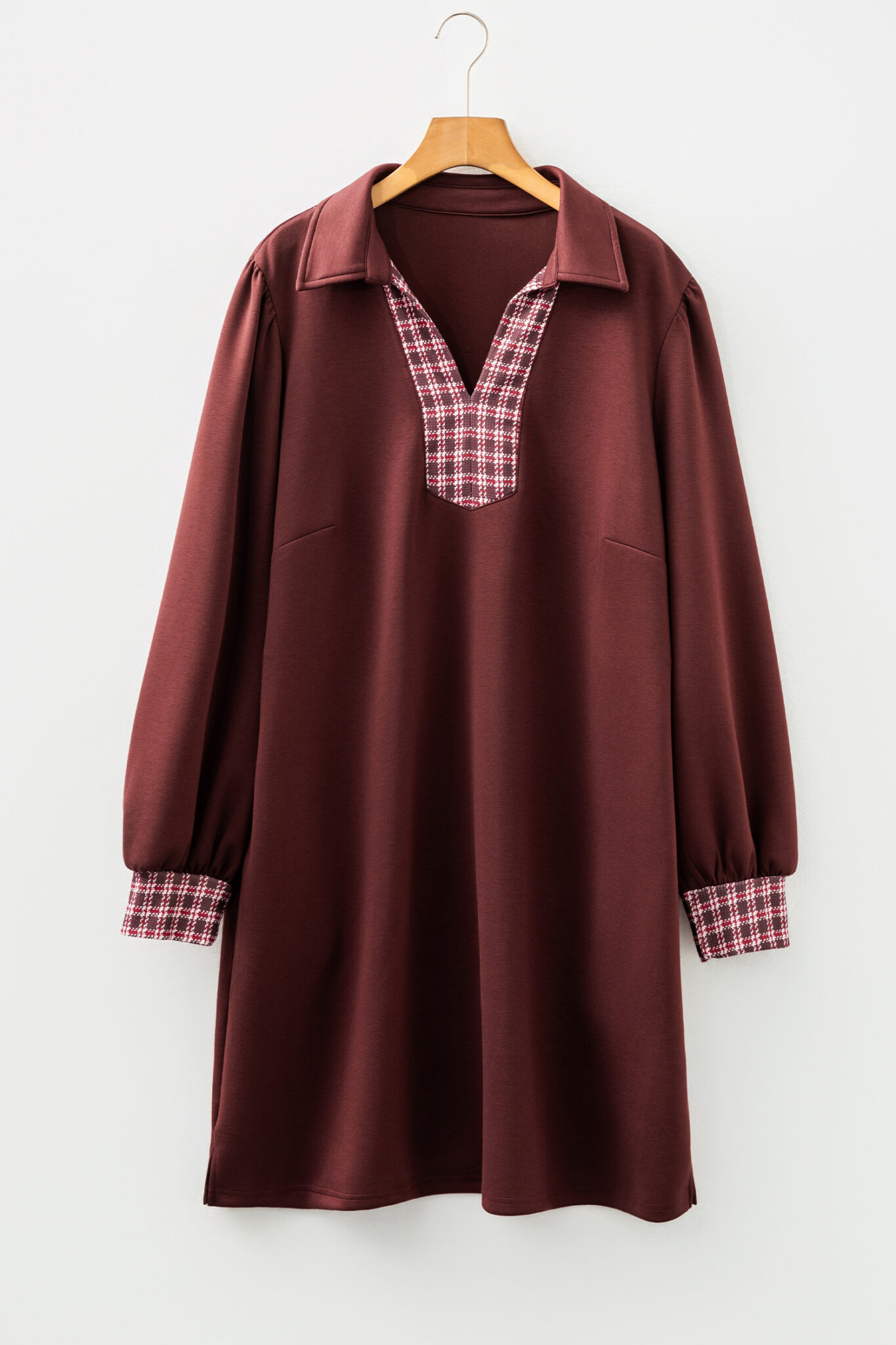 Coffee Contrast Plaid Trim Patchwork Collared Plus Size Shift Mini Dress