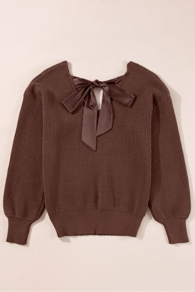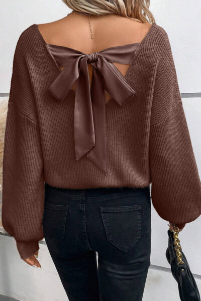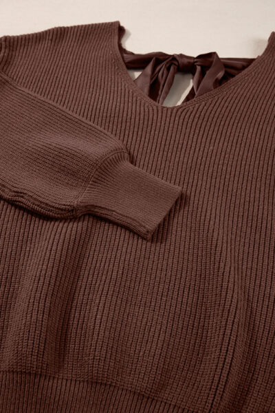 Coffee Lantern Sleeve V Neck Knot Back Sweater