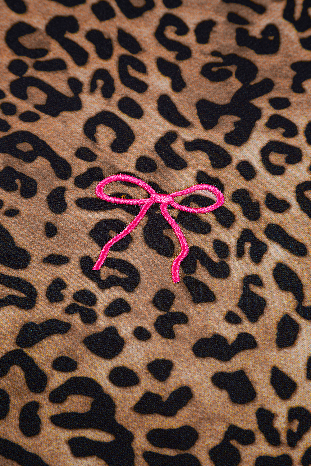 Coffee Leopard Print Contrast Trim Long Sleeve Top and Pants Set