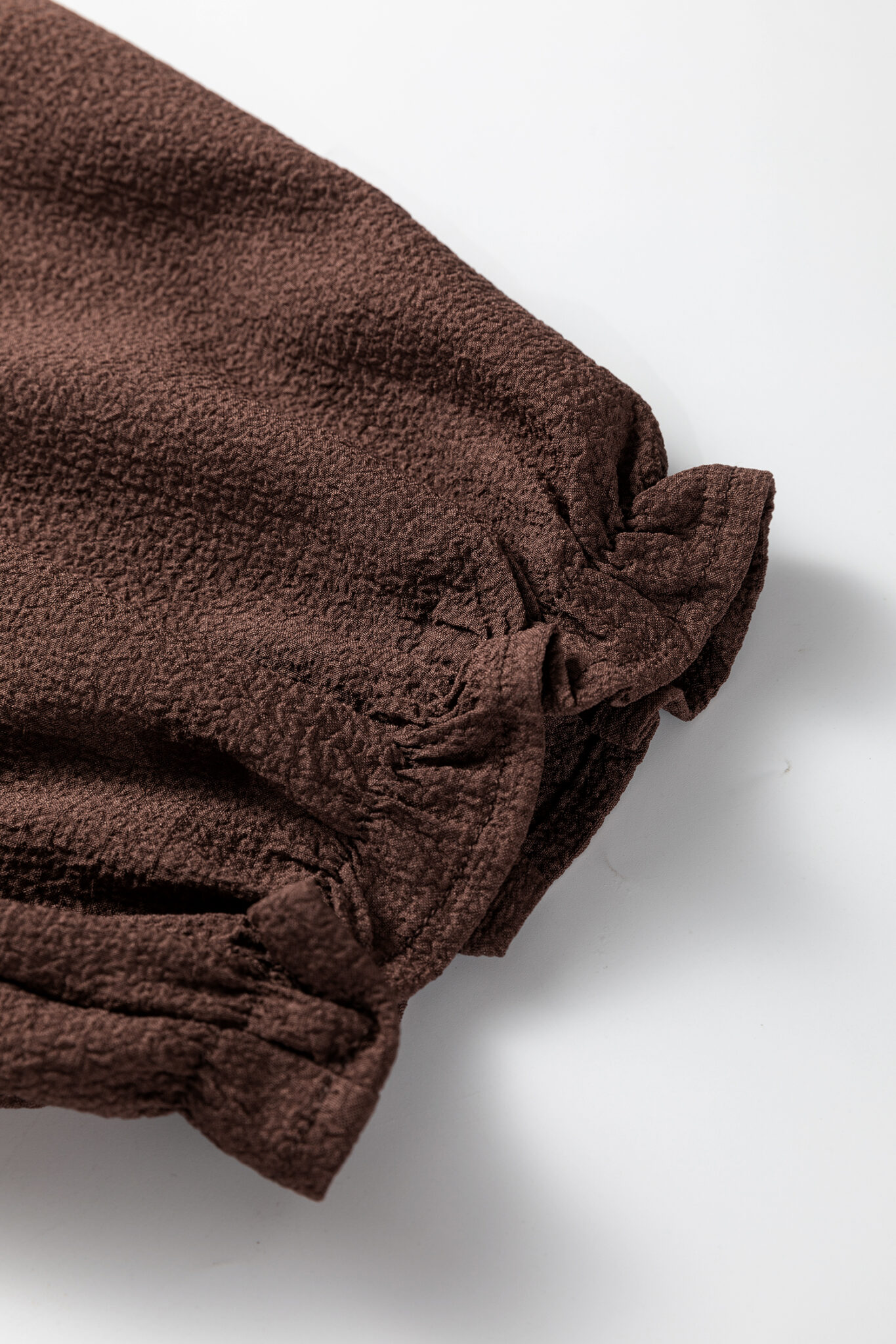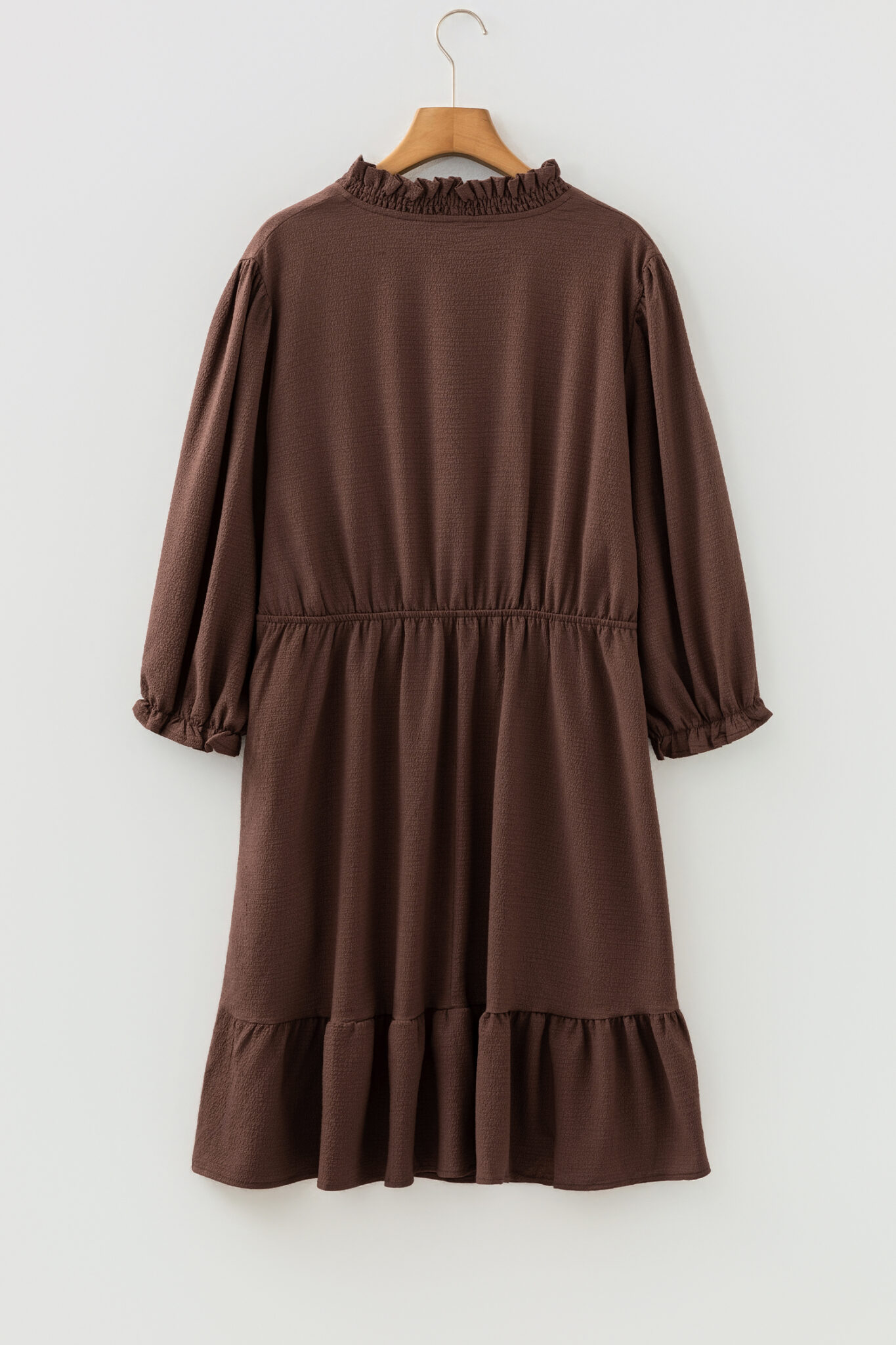 Coffee Plus Size Frilled Trim V Neck Puff Sleeve Textured Mini Dress