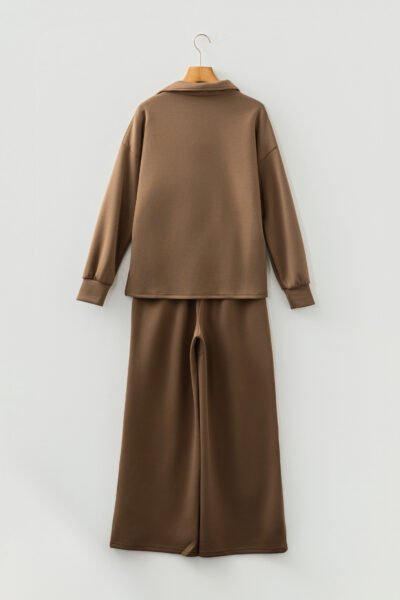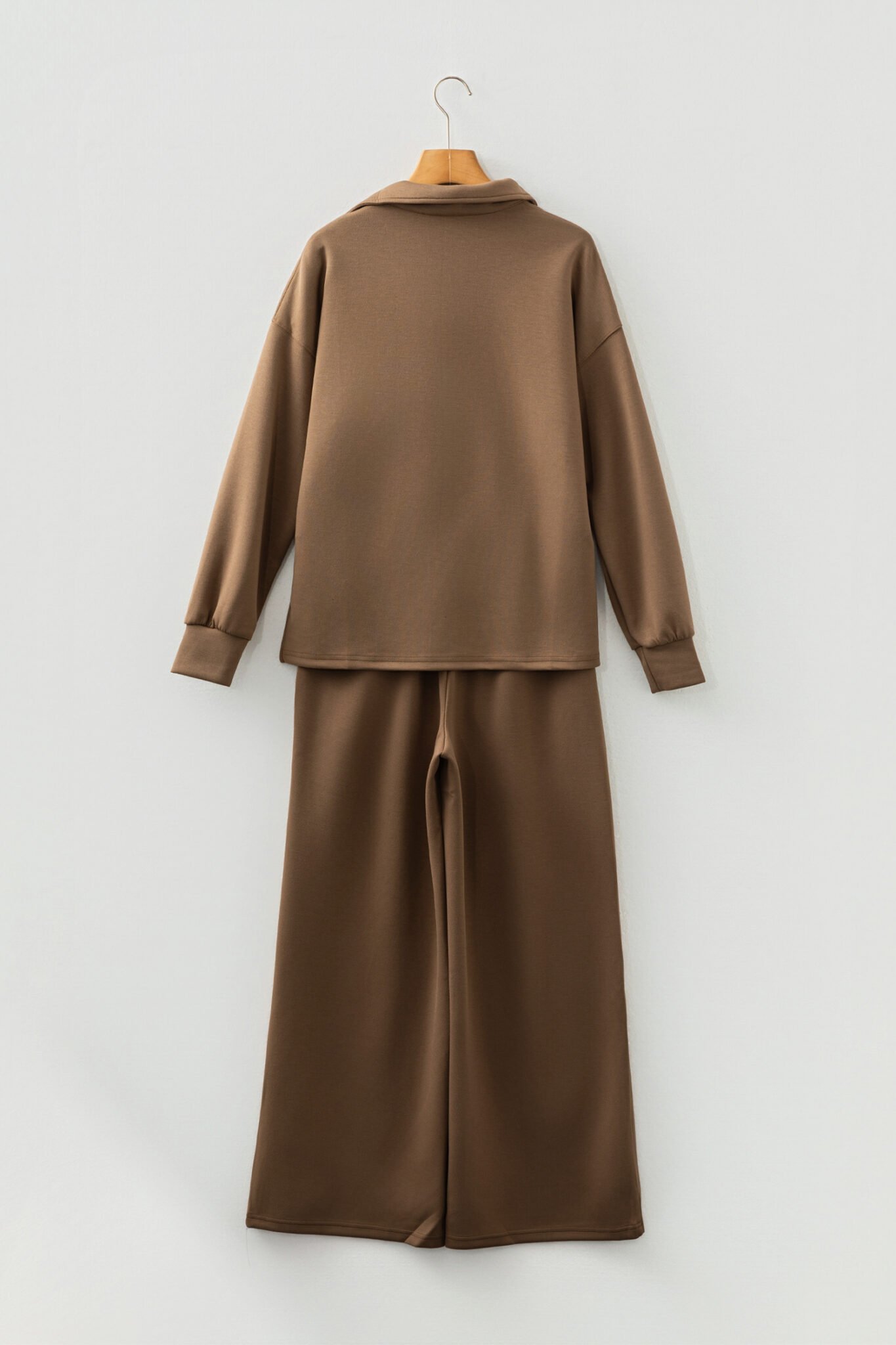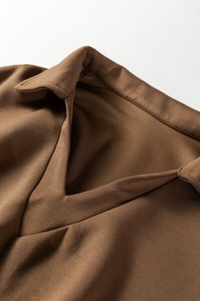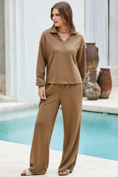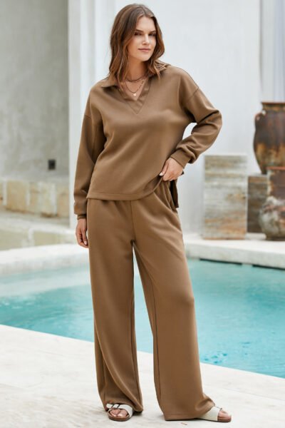 Coffee Solid Color V Neck Top and High Waist Pants Set
