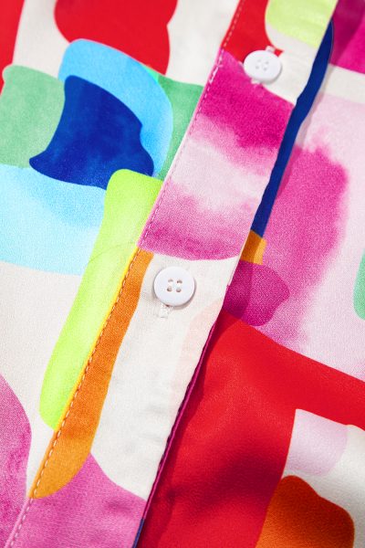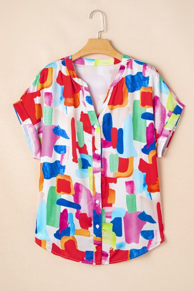Colorful Brush Stroke Printed Plus Size Button Split Neck Blouse