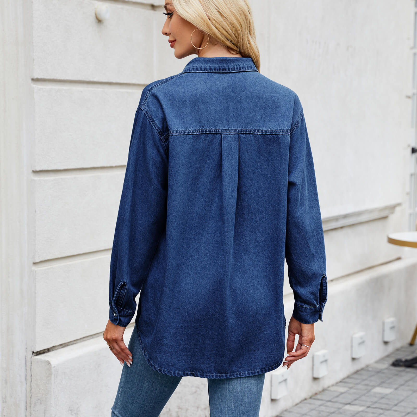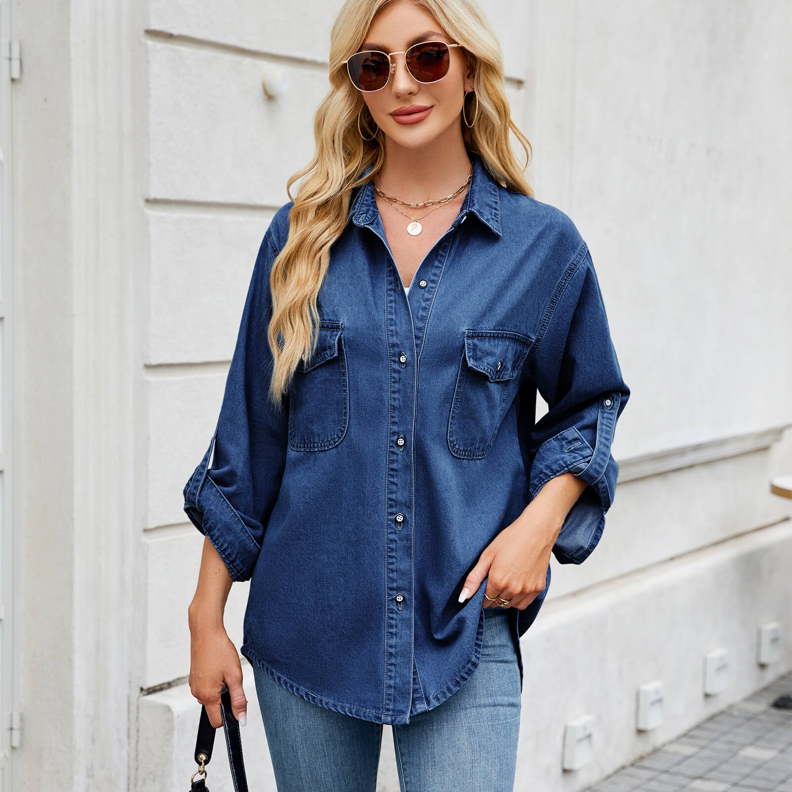 Dark Blue Loose Denim Shirt with Adjustable Sleeves