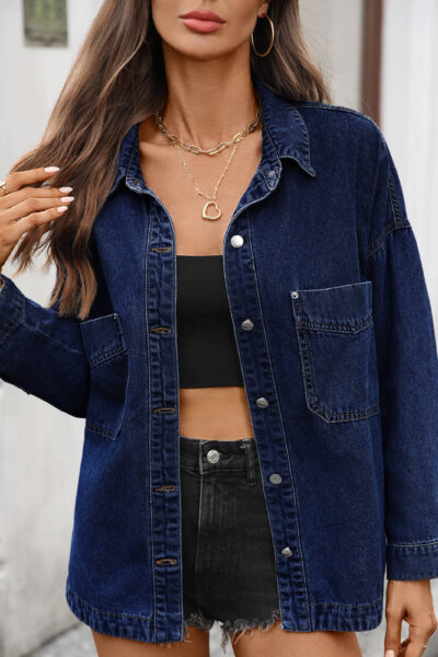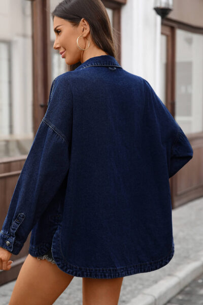 Dark Blue Loose Vintage Denim Overshirt Jacket with Slit Hem