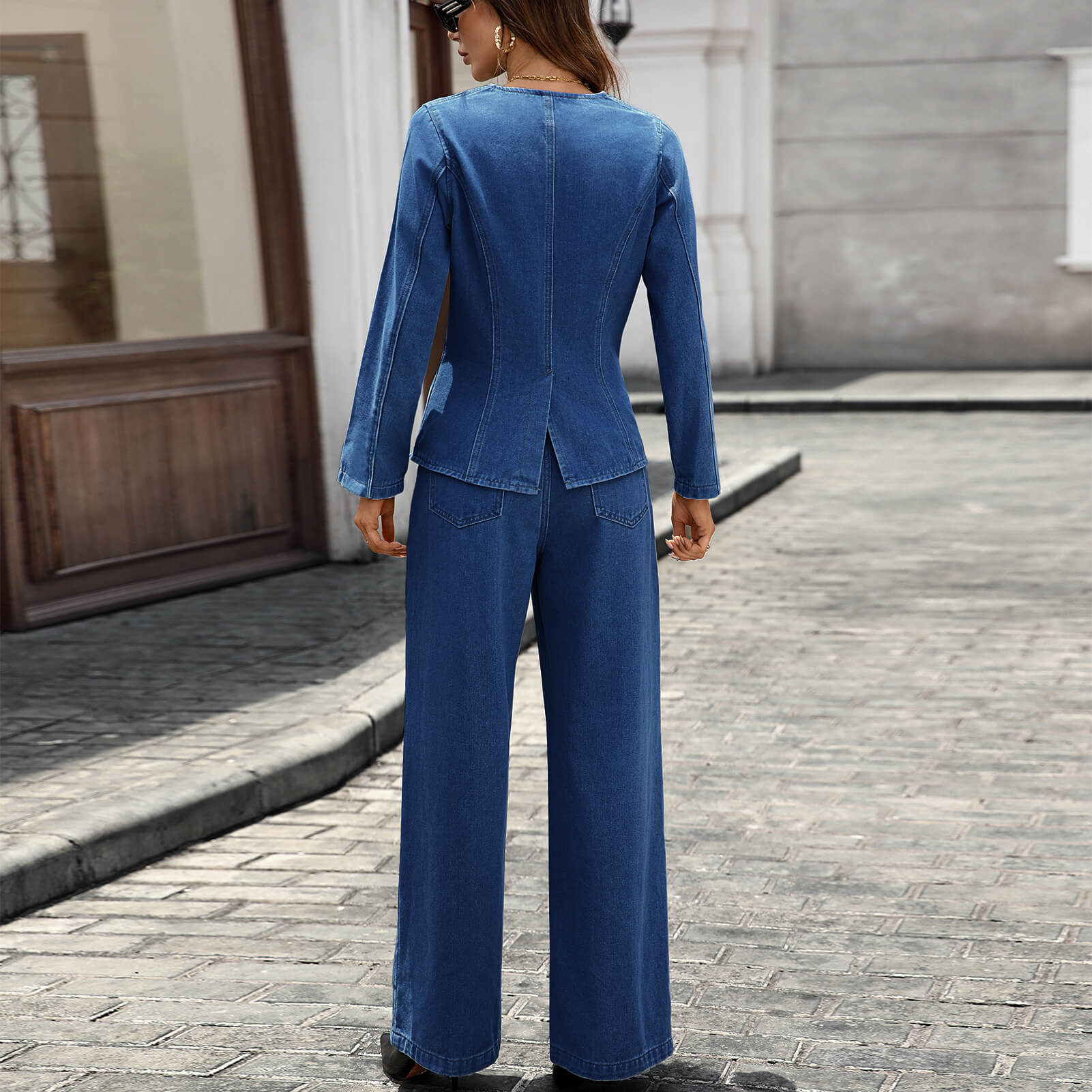 Dark Blue New-In Washed Denim Long Sleeve Top & Pants Set