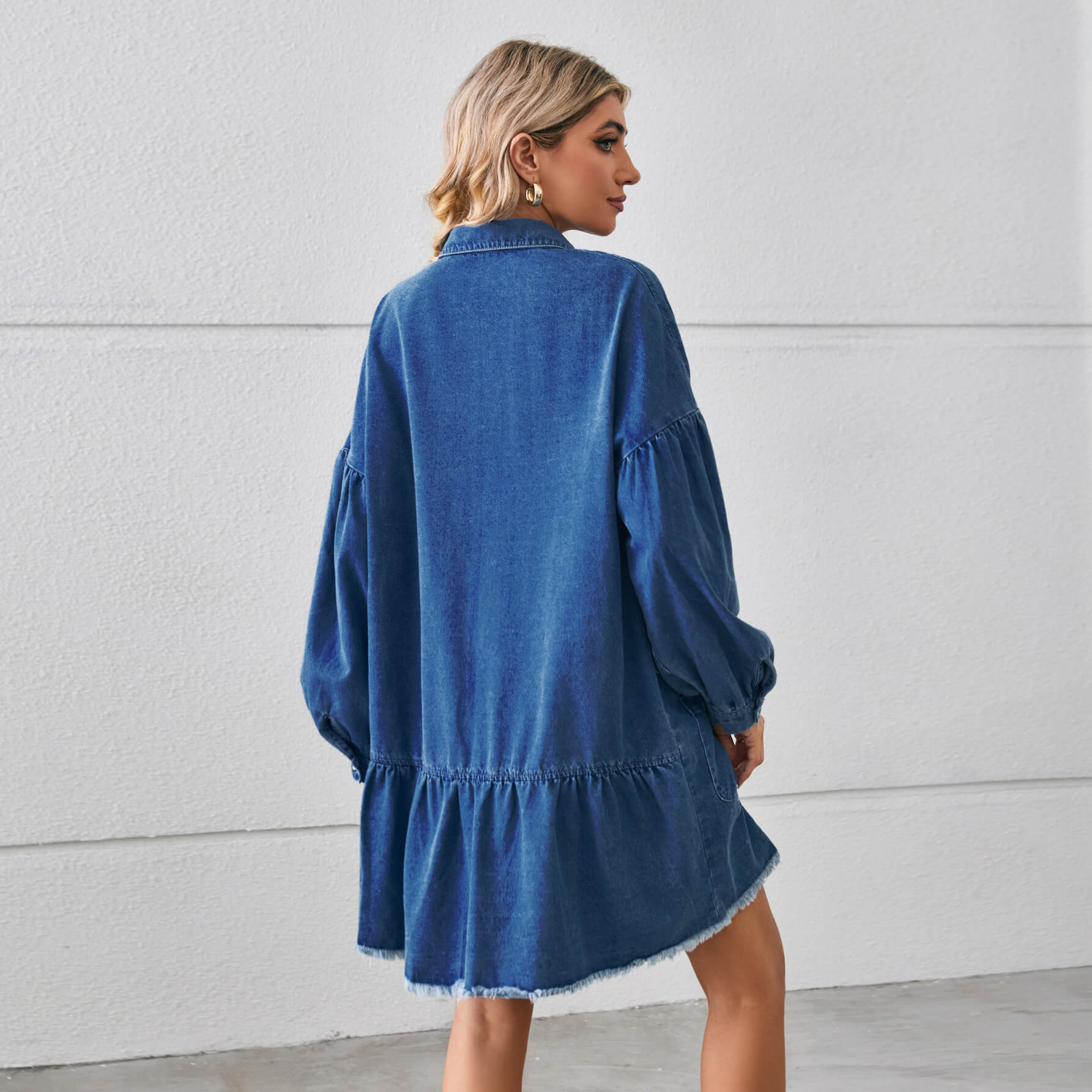 Dark Blue Relaxed Long Sleeve Raw-Edge Denim Midi Dress