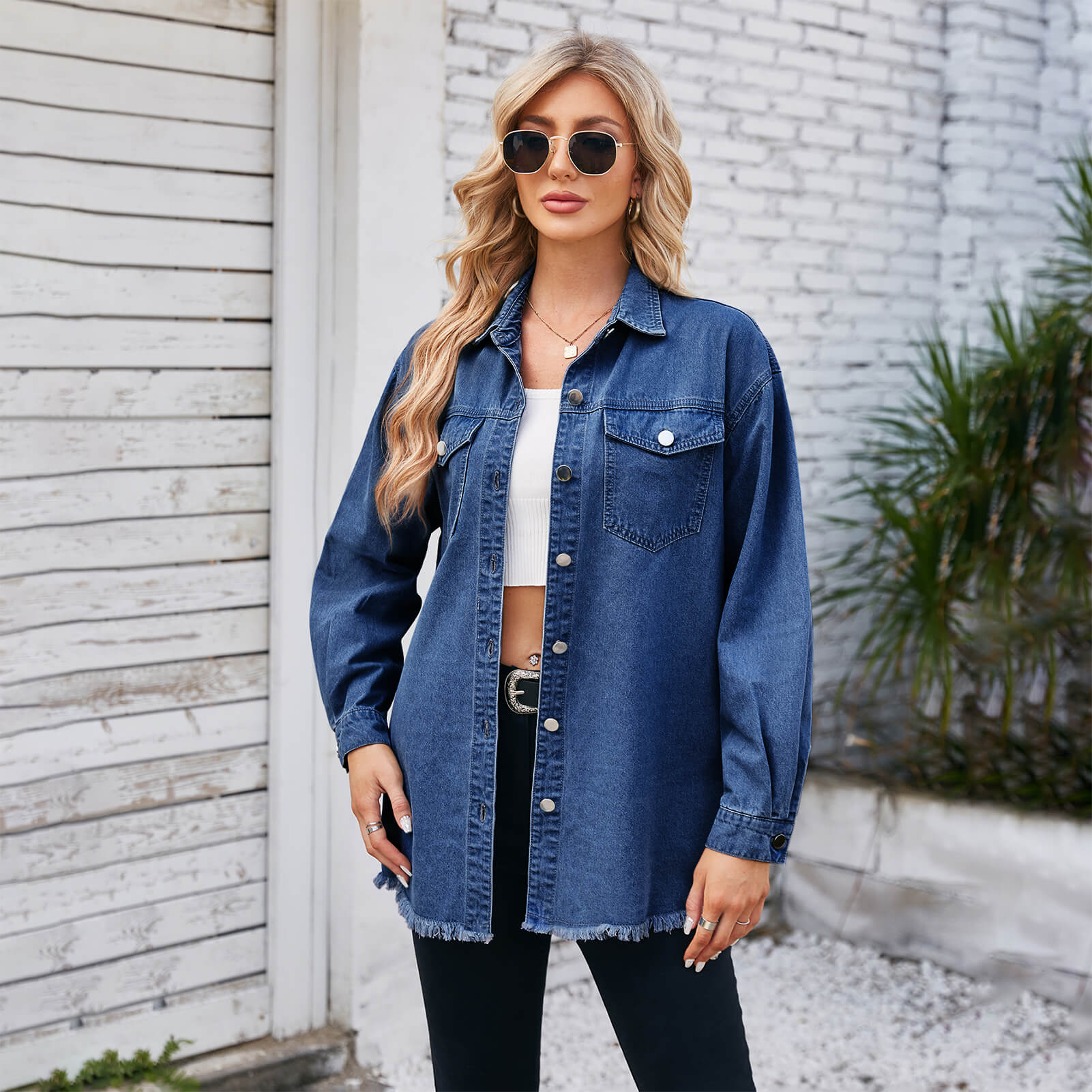 Dark Blue Washed Frayed Long Sleeve Denim Collared Top