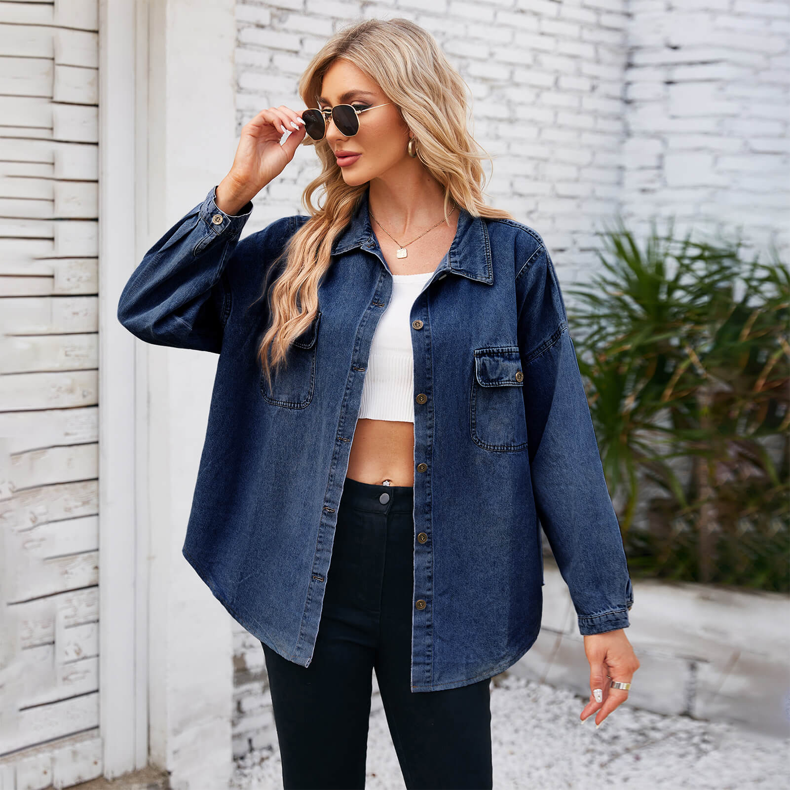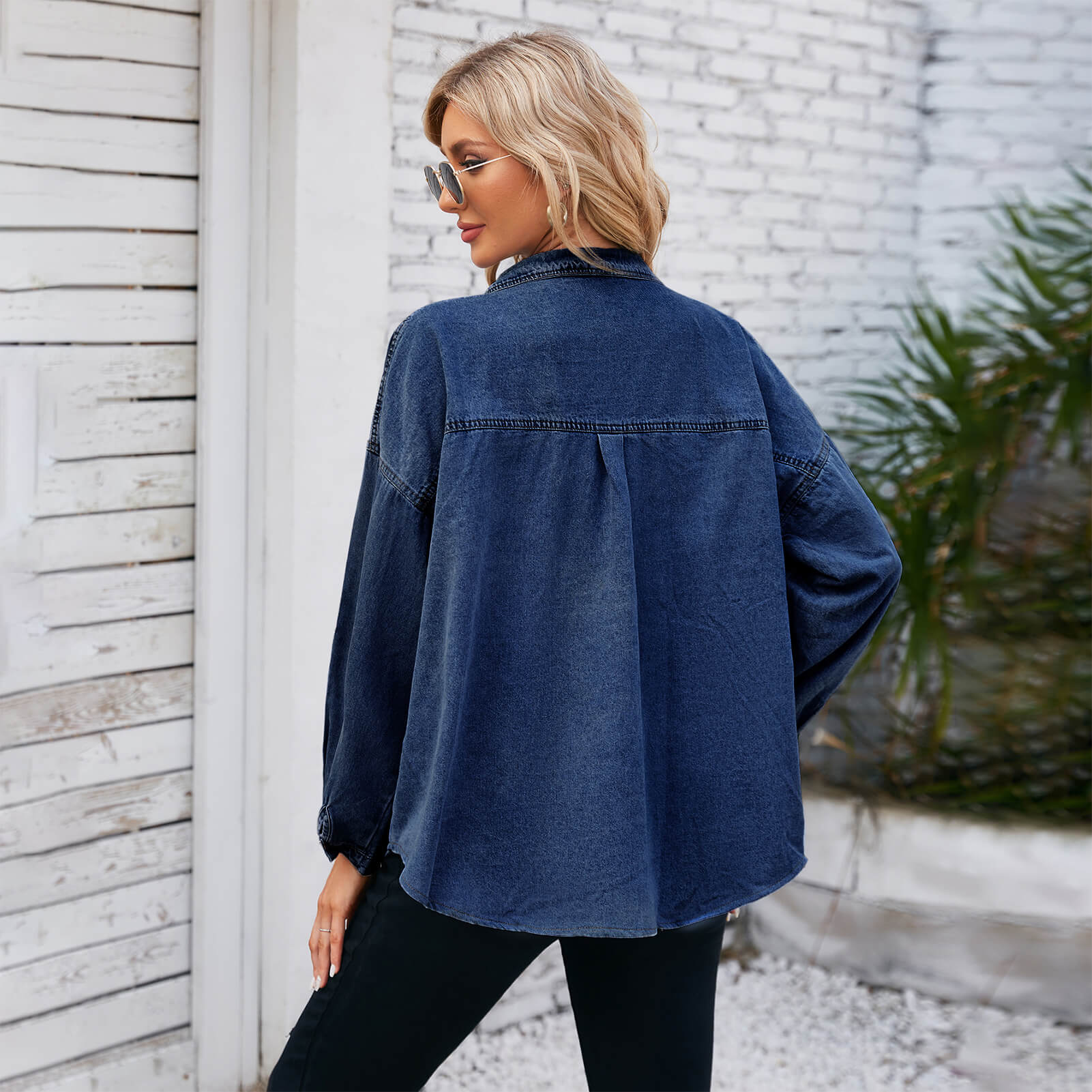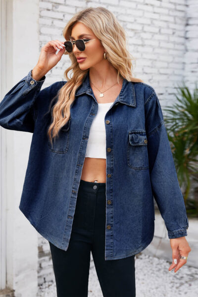 Dark Blue Washed Loose-Fit Denim Top with Flap Pockets