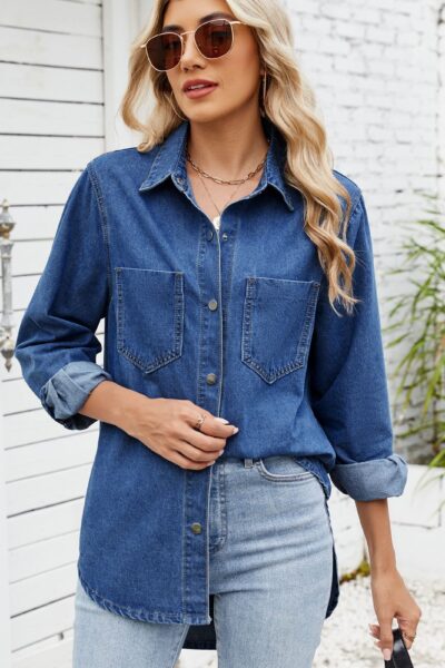Dark blue washed loose fitting long sleeve denim shacket