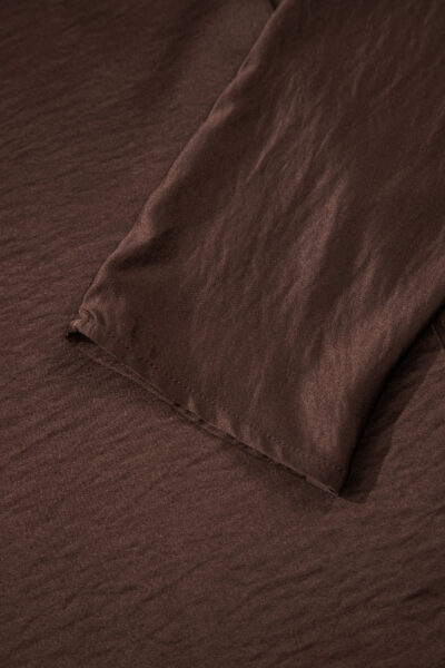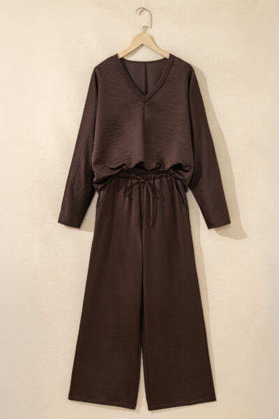 Dark Brown Braided V Neck Long Sleeve Loose Top and Drawstring High Waist Pants 2pcs Outfit