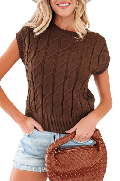 Dark Brown Cable Texture Crew Neck Short Sleeve Sweater Top