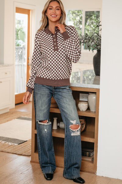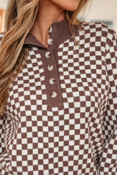 Dark Brown Half Button Ribbed Trim Checkerboard Knit Sweater