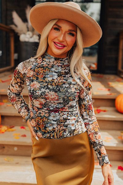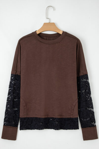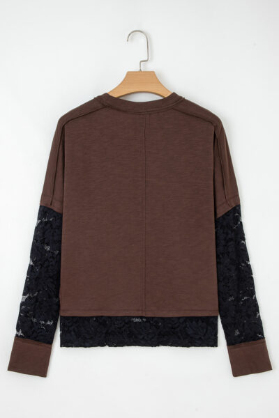 Dark Brown Sheer Lace Patchwork Casual Long Sleeve Tee