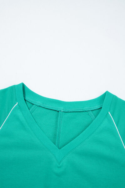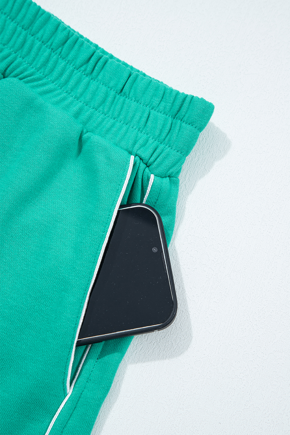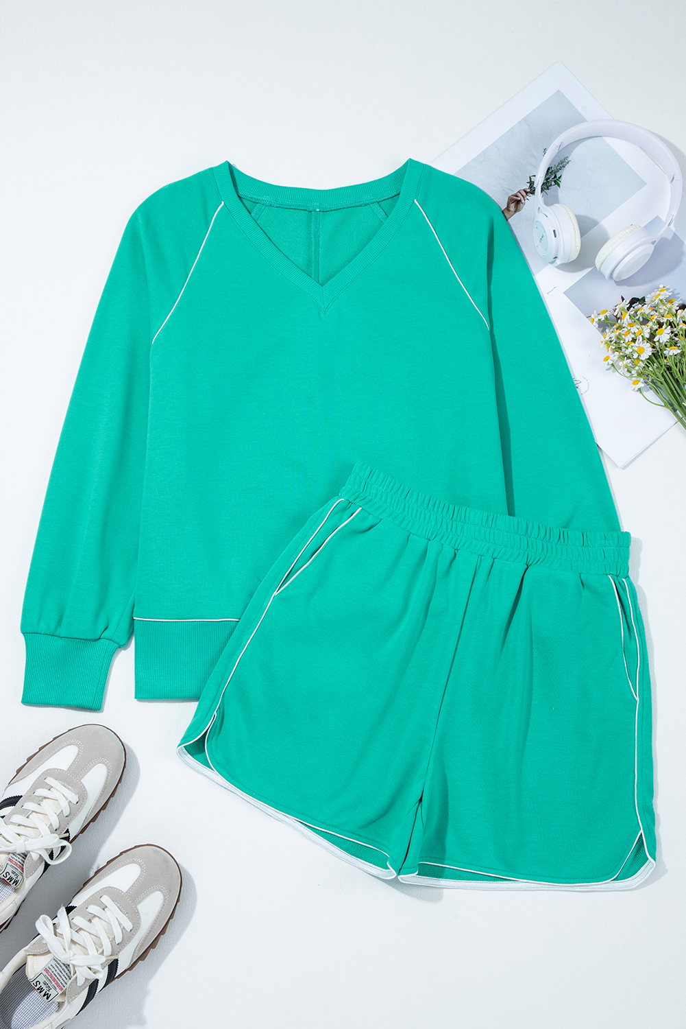 Dark Green Colorblock Trim V Neck Pullover Top and Shorts Set