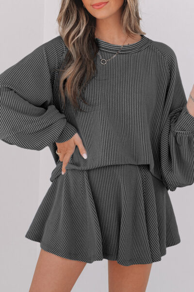 Dark Grey Corded Lantern Sleeve Top High Waist Ruffled Mini Skirt Set