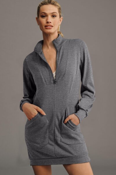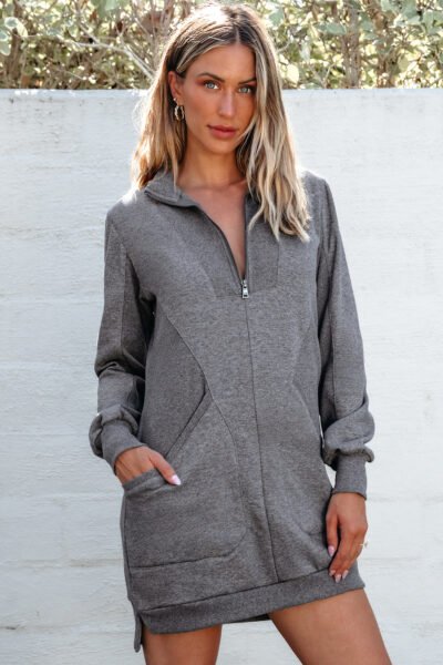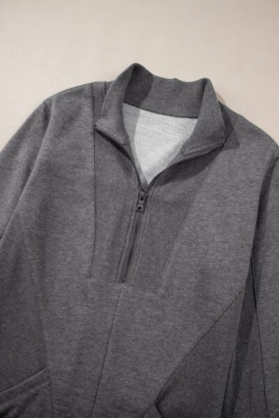 Dark Grey Zip up Collared Ribbed Patchwork Sweatshirt Dress with Pockets