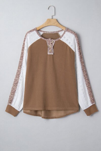 Dark Khaki Twisted Ribbed Leopard Lace Contrast Patchwork Long Sleeve Top