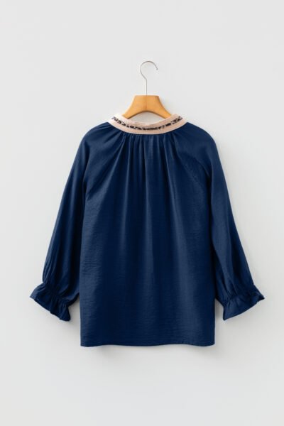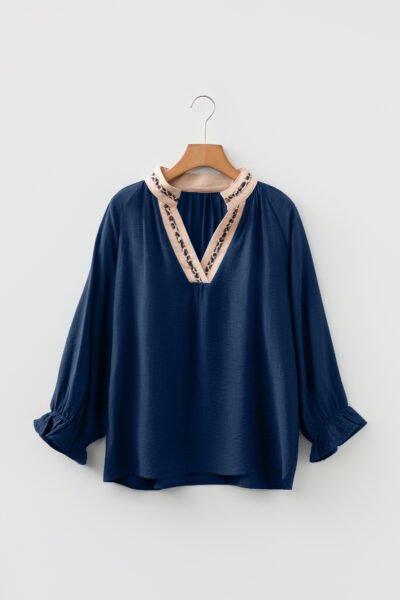 Dirty blue Leopard Trim V Neck Flounced Bracelet Sleeve Blouse