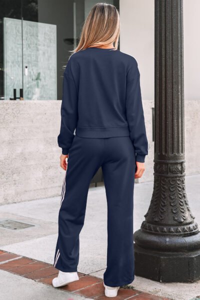 Dirty blue Varsity Striped Detail Crewneck Pullover Elastic Sweatpants 2pcs Outfit
