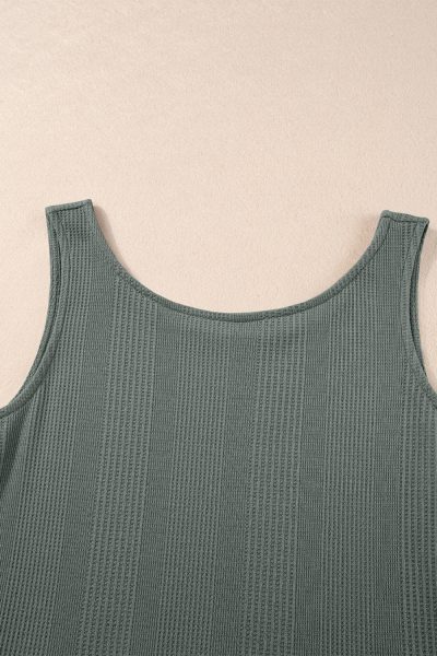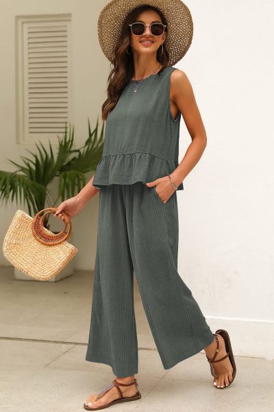 Duffel Green Solid Color Ribbed Ruffle Tank Top and Pants Set