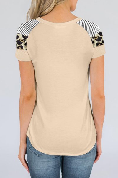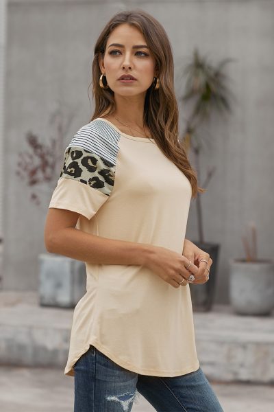Duffy Women’s Round Neck Short Sleeve Striped Leopard Print T Shirt Tops Khaki