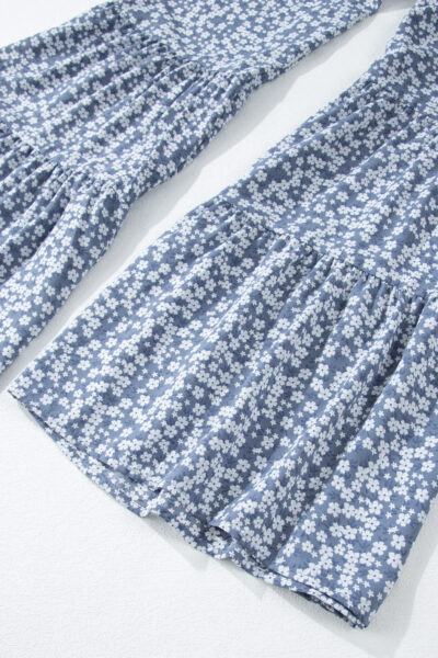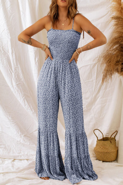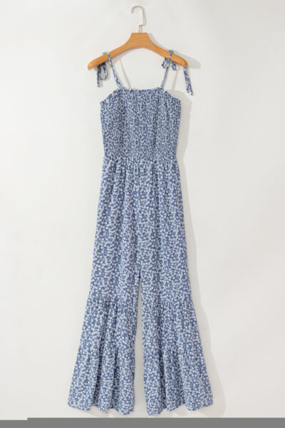 Dusk Blue Thin Straps Smocked Bodice Wide Leg Floral Jumpsuit