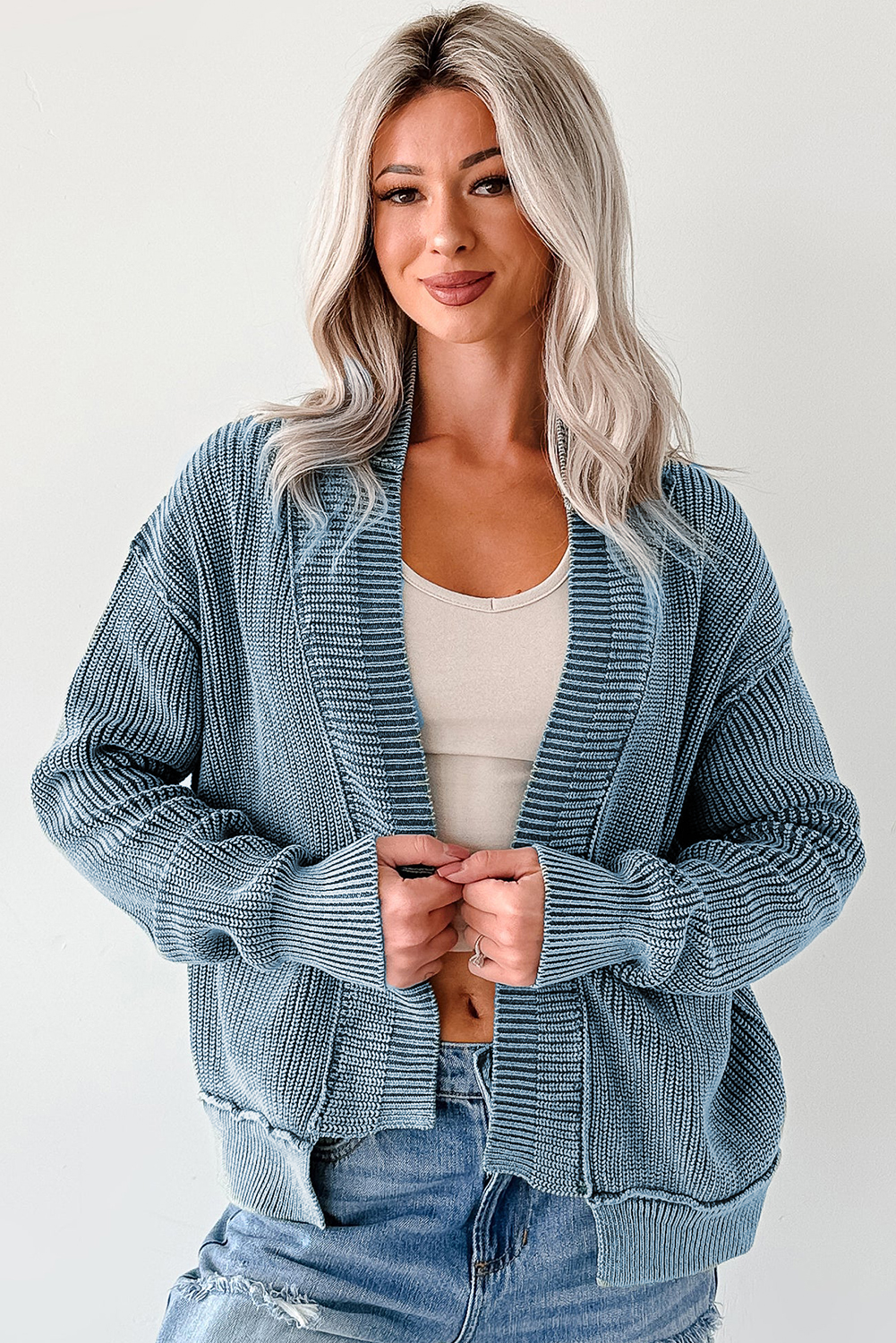 Evergreen Mineral Wash Exposed Seam Patchwork Knit Open Sweater Cardigan