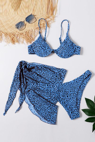 Felicia Women’s Sexy Blue 3pcs Leopard Bikini & Sarong Swim Set