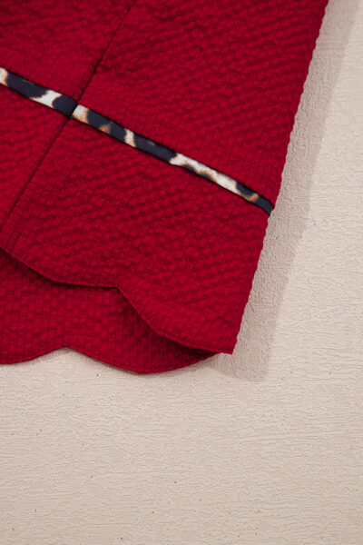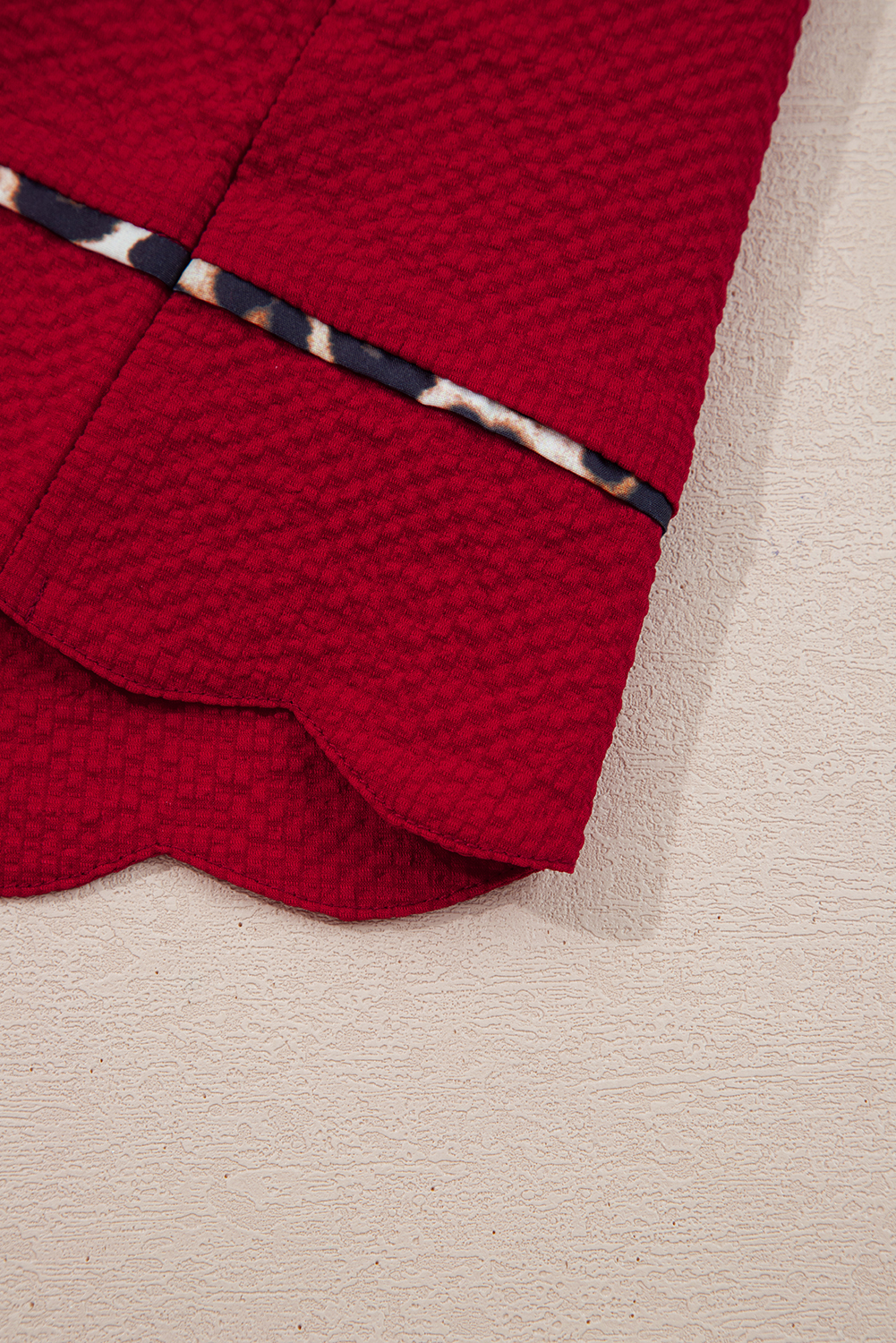 Fiery Red Collar V Neck Leopard Contrasted Trim Textured Blouse