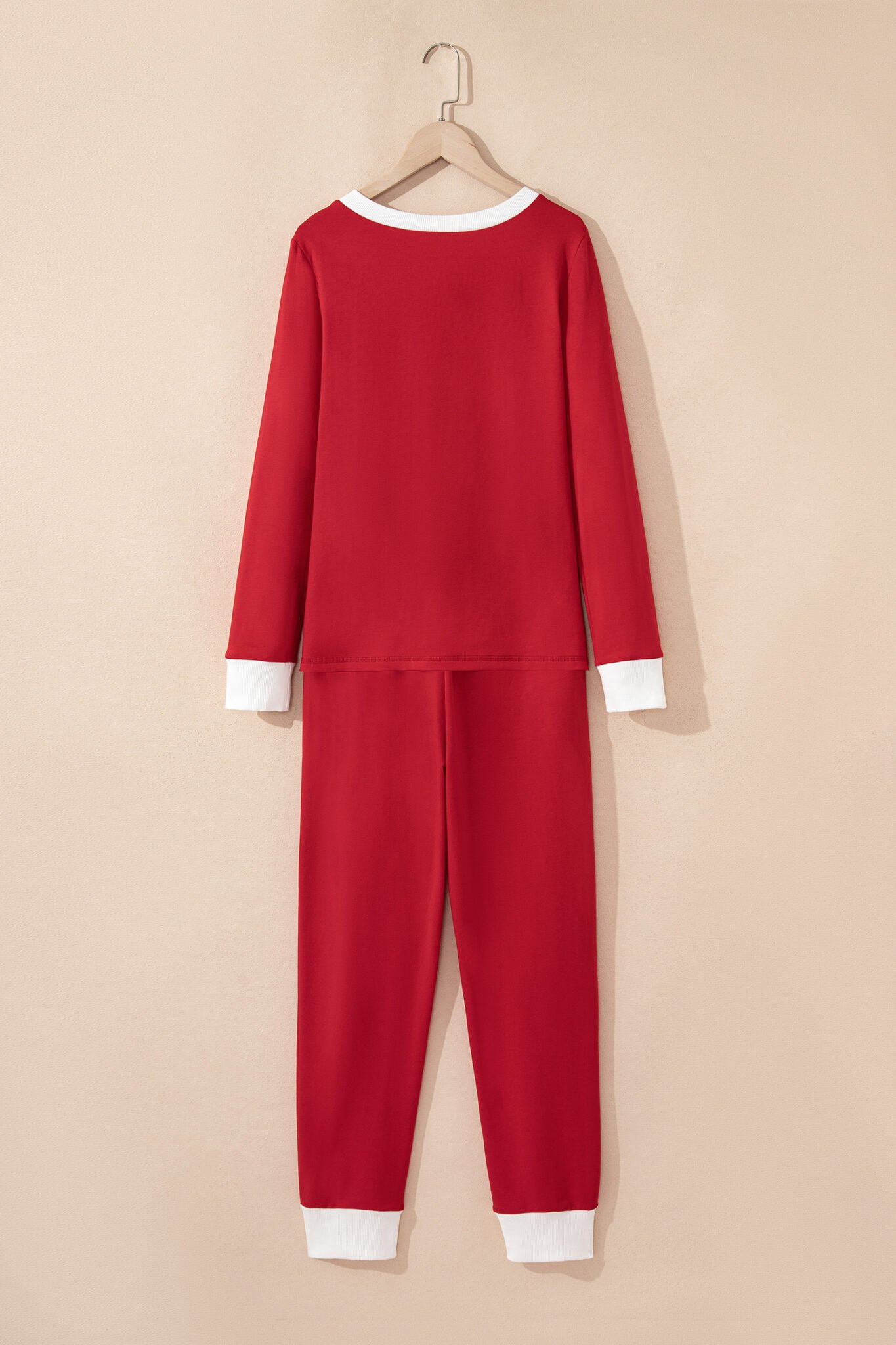 Fiery Red Contrast Trim Button V Neck Ribbon Bow Knot Waist 2pcs Lounge Pant Set