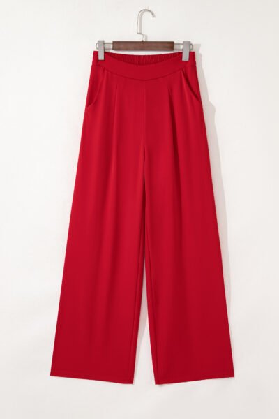 Fiery Red Pleated Detail Pull On High Elastic Waist Loose Straight Pants