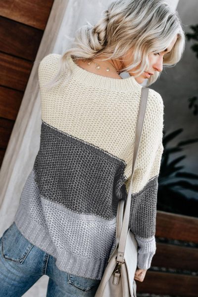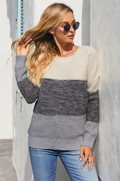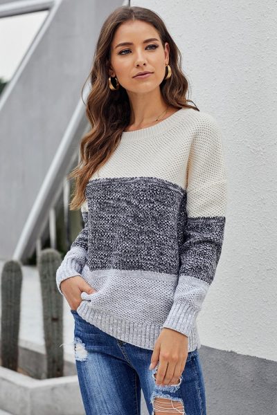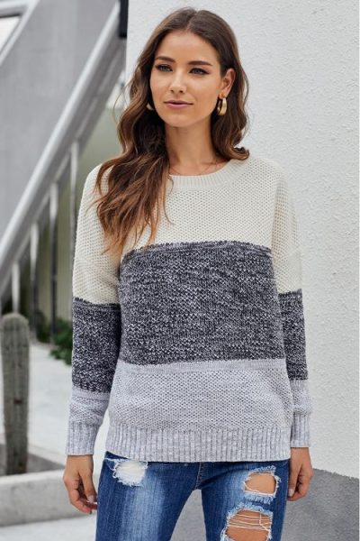 Gauzy Women Color Block Striped Casual Pullover Sweater Gray