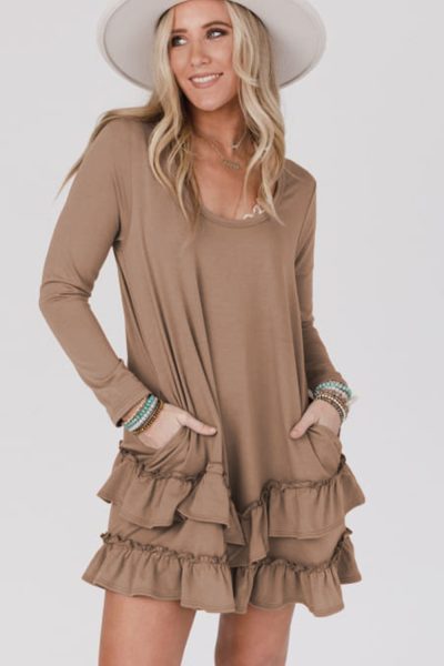 Goat Scoop Neck Tiered Ruffled Hem Long Sleeve Mini Dress