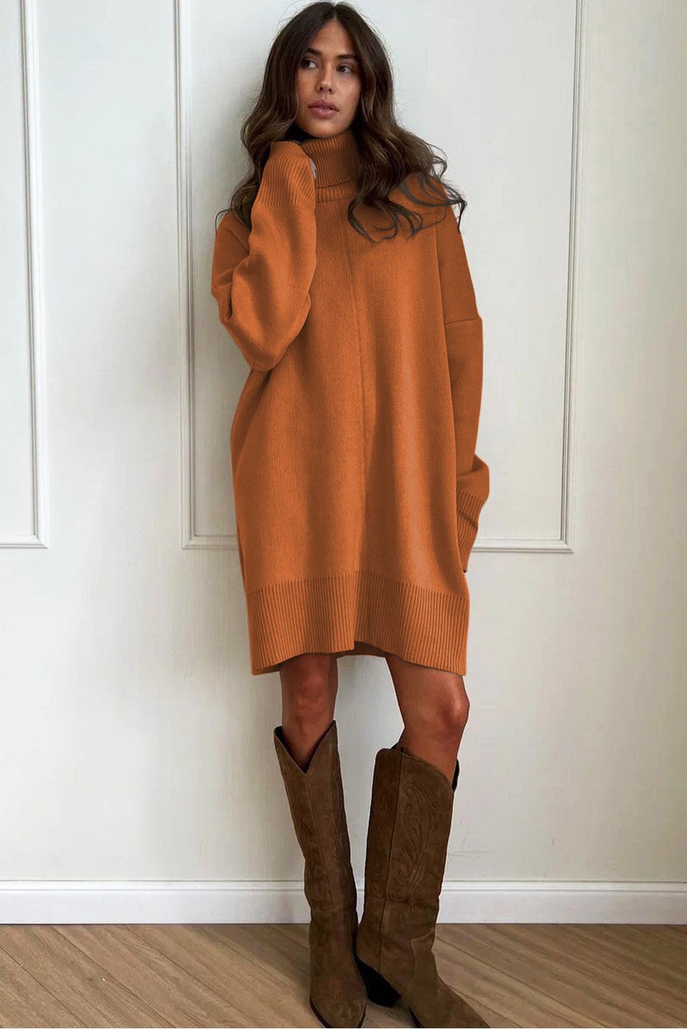 Gold Flame Solid Color Turtleneck Drop Shoulder Loose Sweater Dress