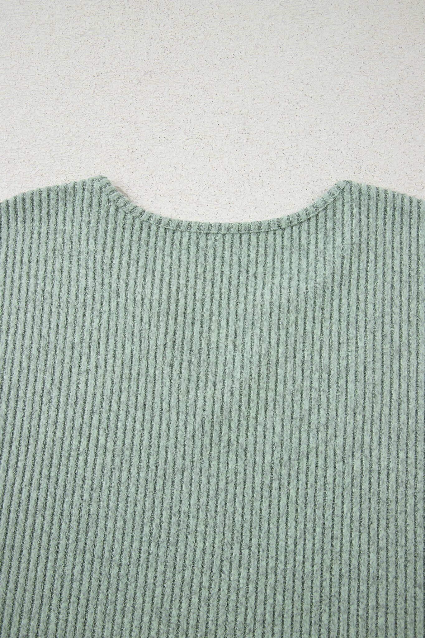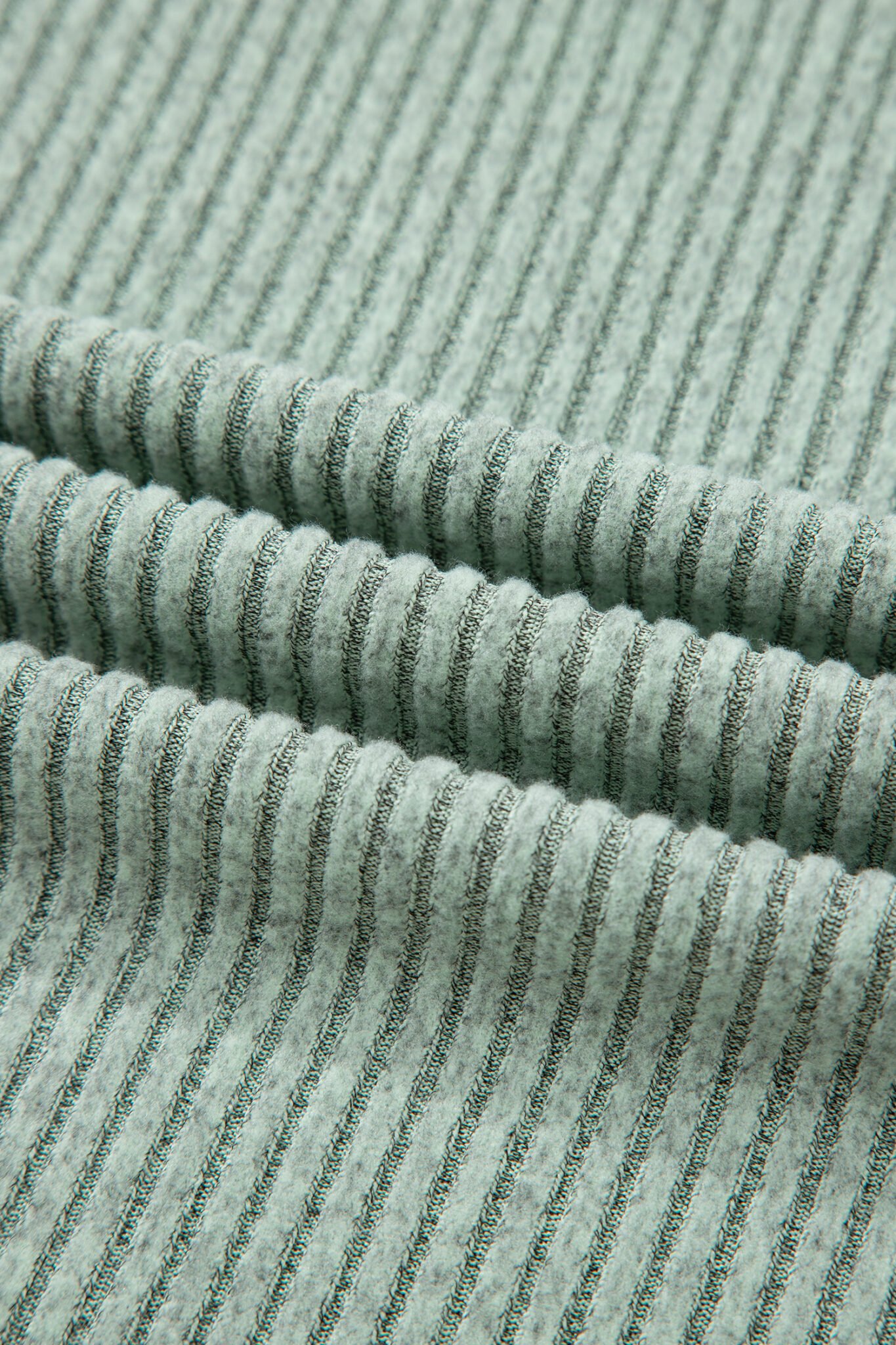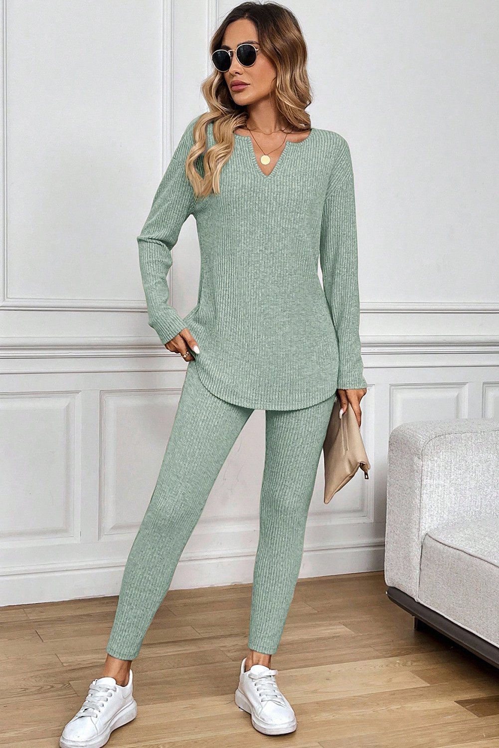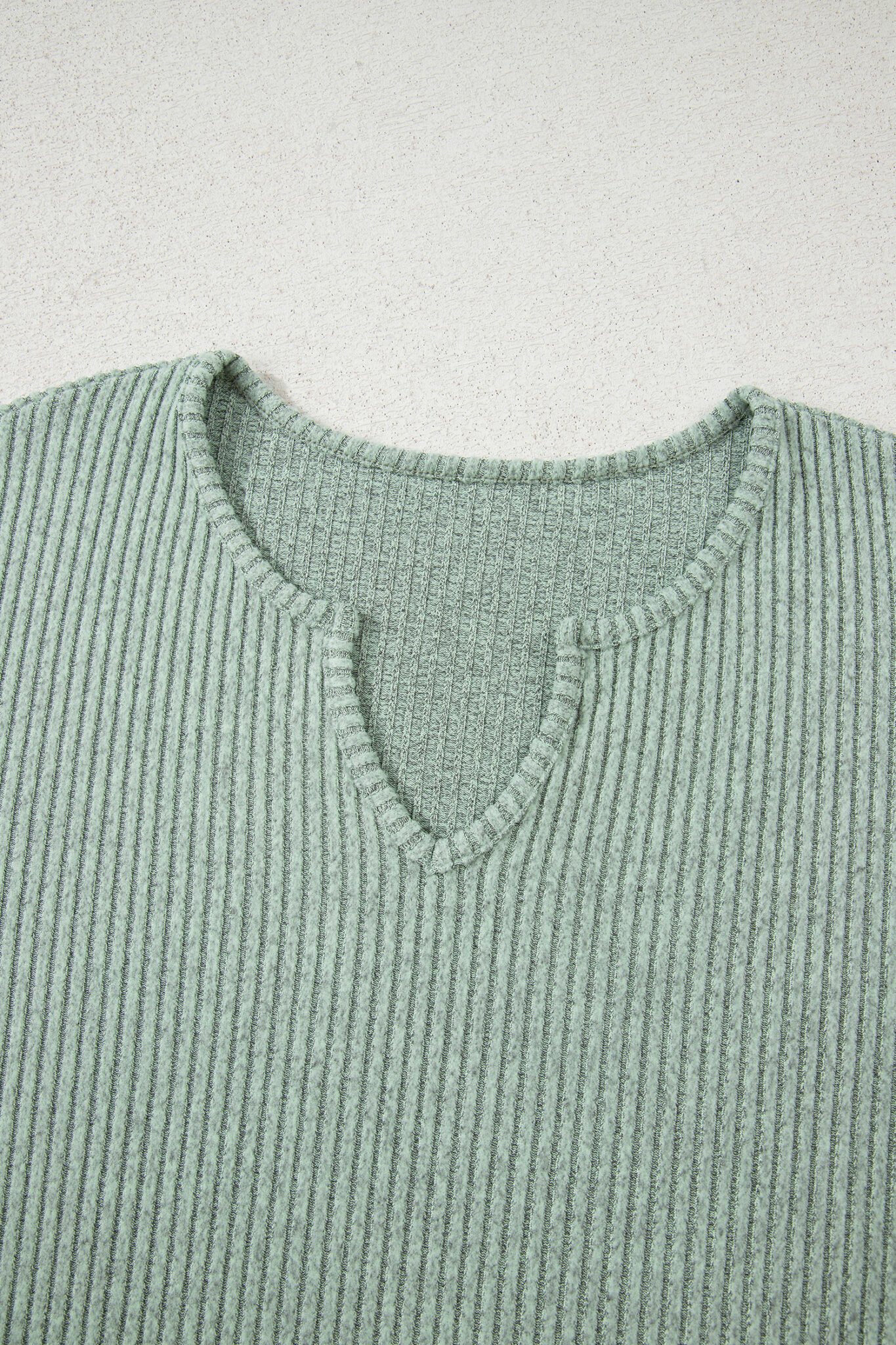 Grass Green Ribbed Notched Neck Knit Long Sleeve Leggings Two Pieces Lounge Set