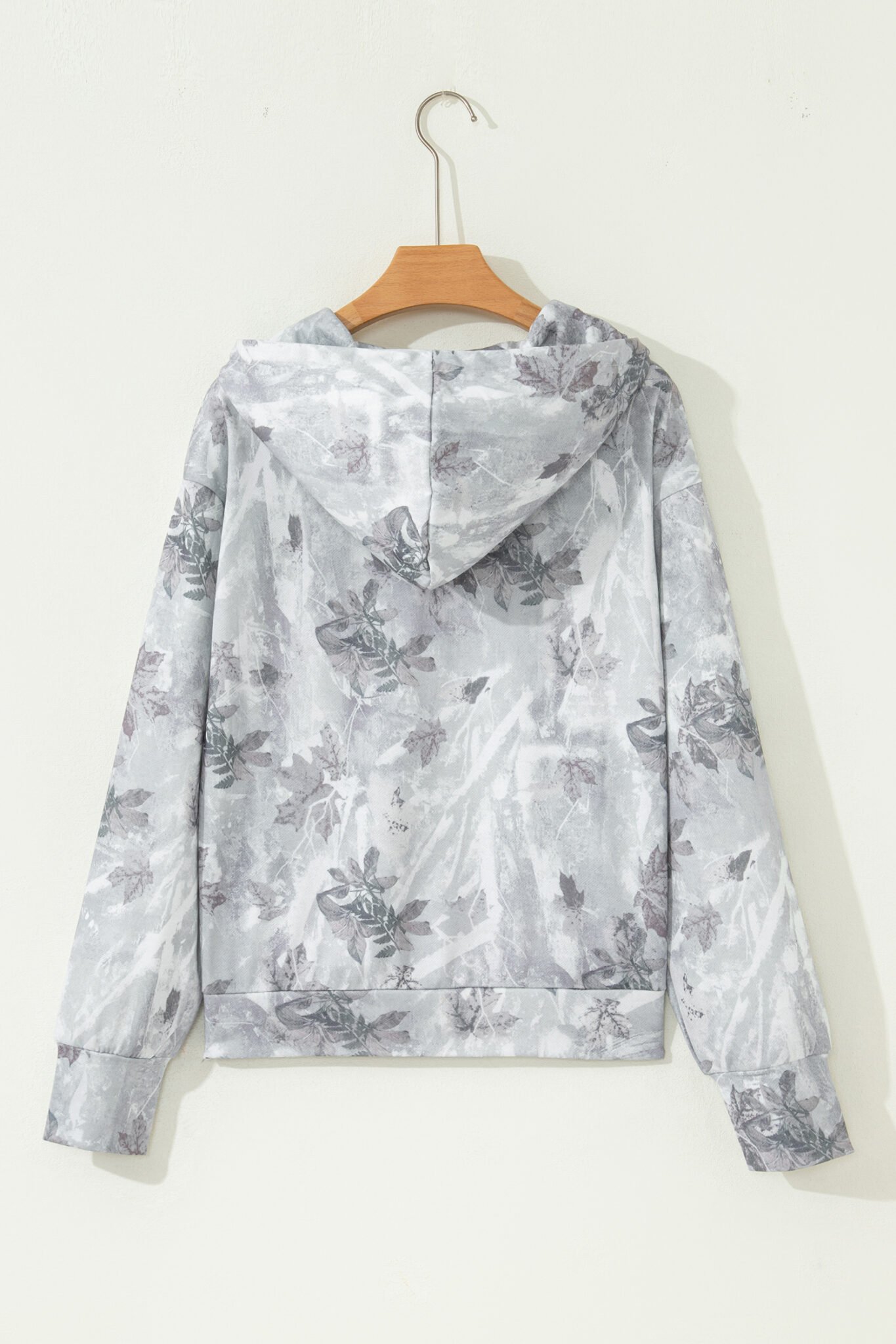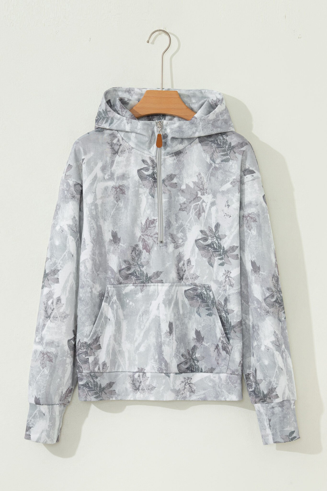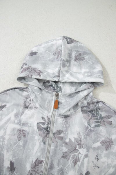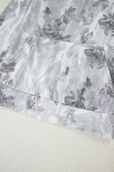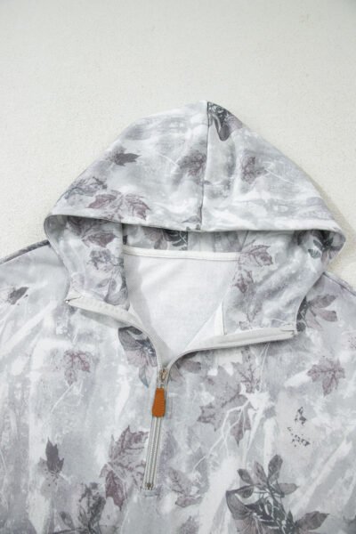 Gray Camo Leaf Print Kangaroo Pocket Quarter Zip Hoodie