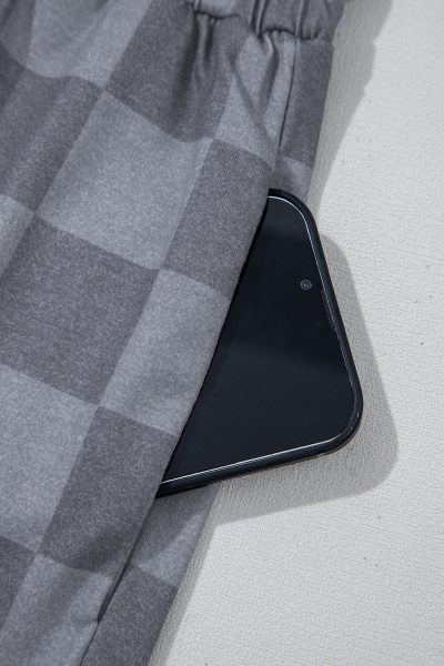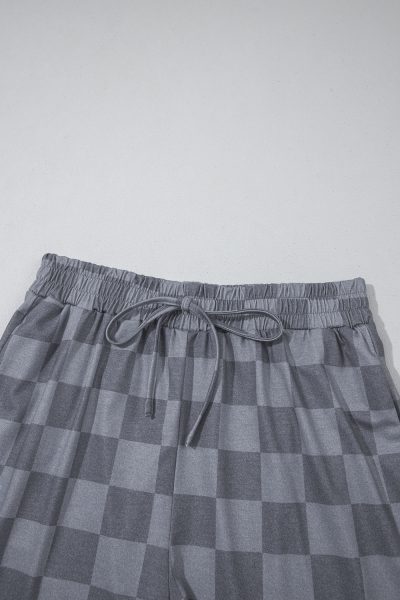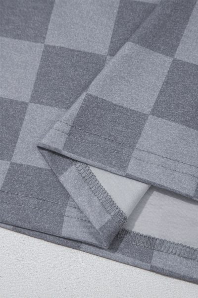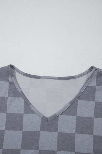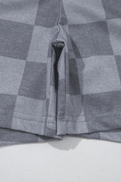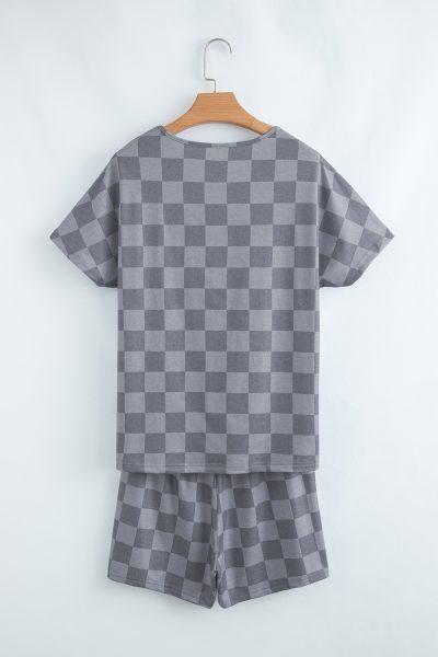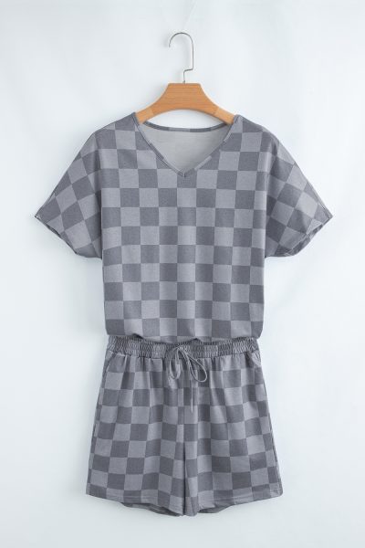 Gray Checkered V Neck Tee Drawstring Shorts Lounge Set