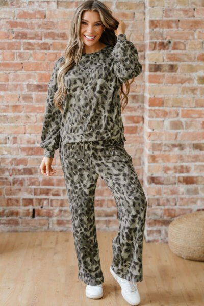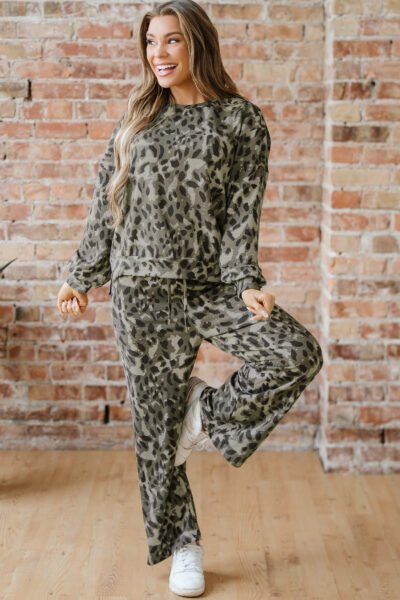 Gray Leopard Print Raw Seam Patchwork Pullover Drawstring Loose Pant Set