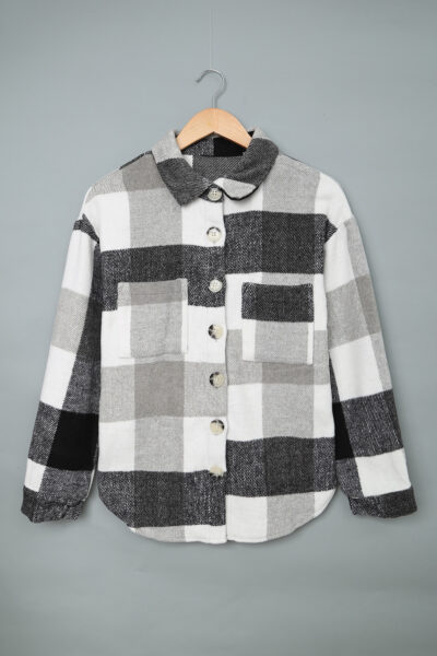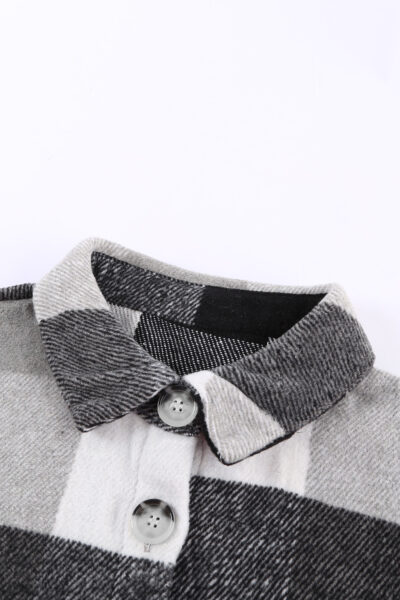 Gray Plaid Color Block Buttoned Long Sleeve Jacket with Pocket