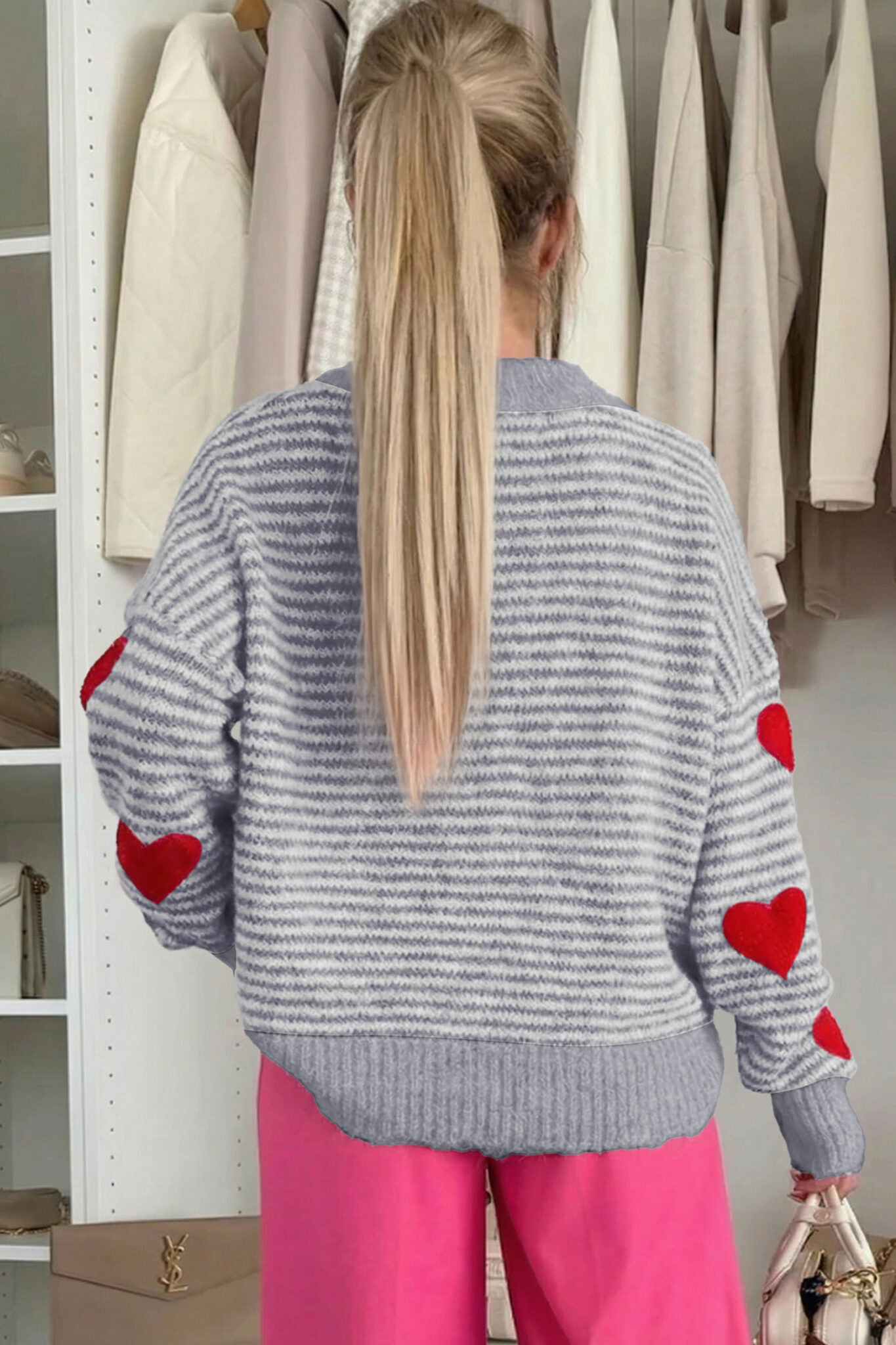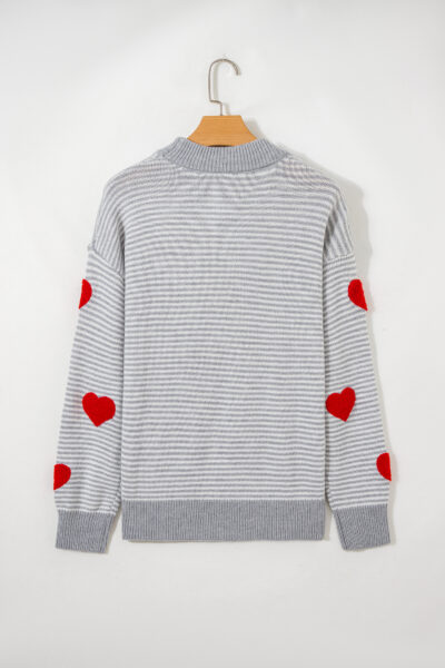 Gray Stripe Contrast Heart Pattern Valentine Knit Sweater