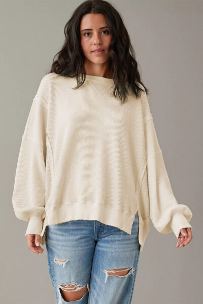 Gray Waffle knit Bishop Sleeve Split Oversized Top