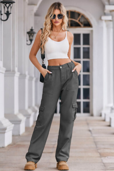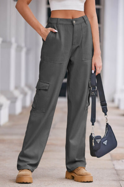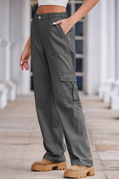 Gray Washed Denim Cargo Pants with Large Pockets and Semi-Elastic Waist