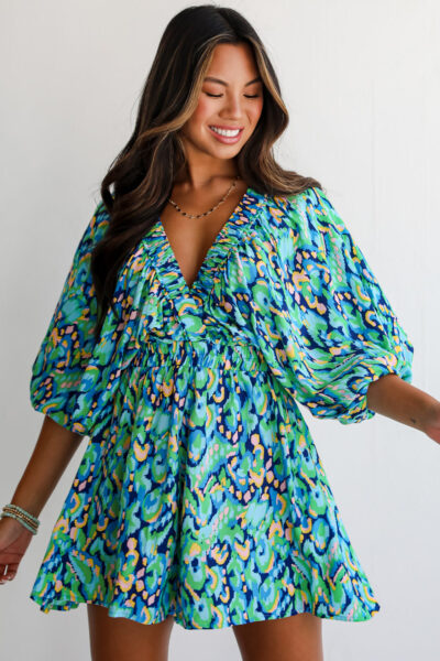 Green Abstract Print Puff Sleeve V Neck High Waist Romper