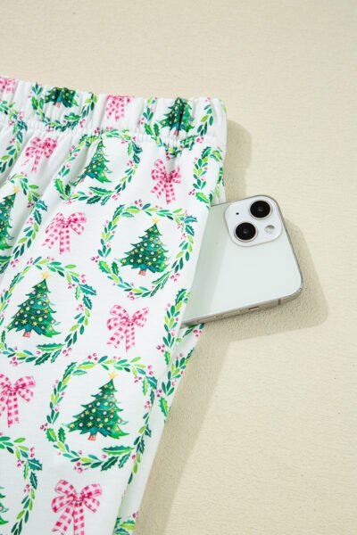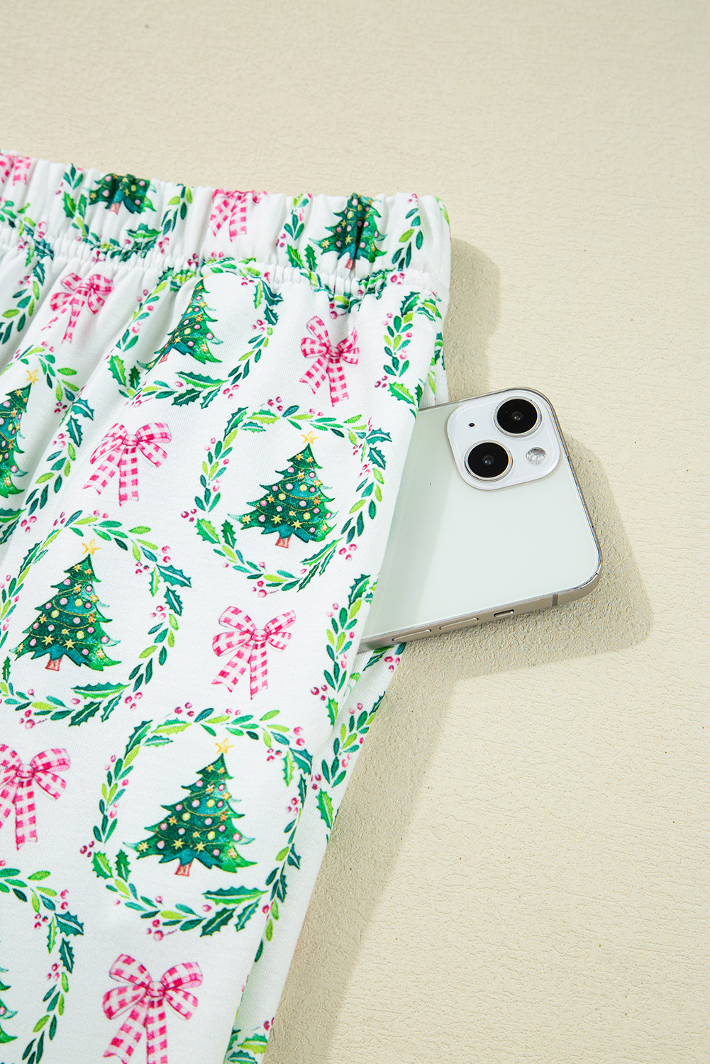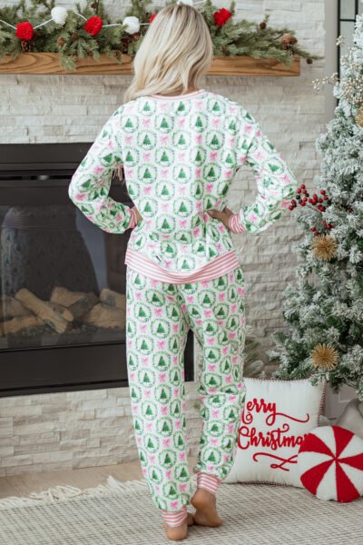 Green Bow Christmas Tree Print Contrast Striped Banding 2pcs Lounge Set