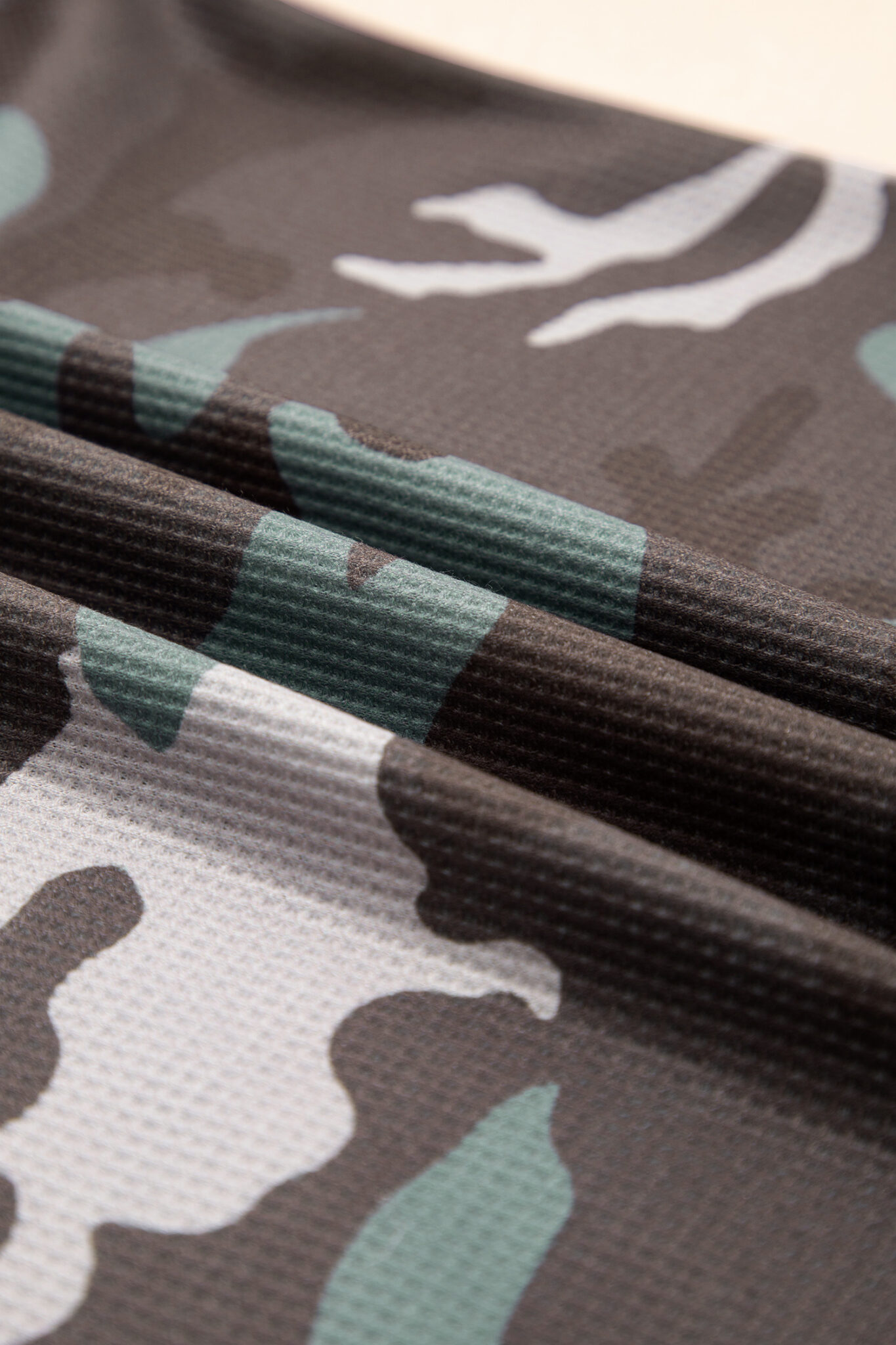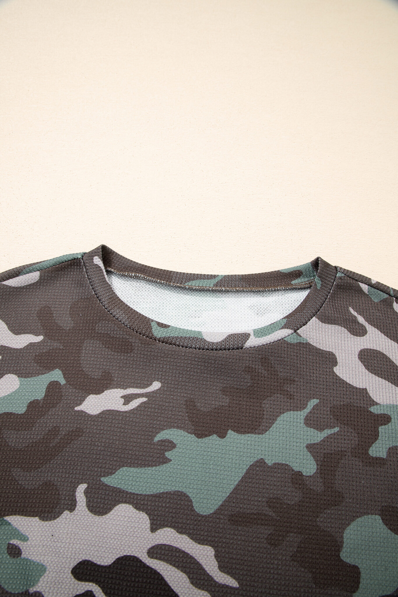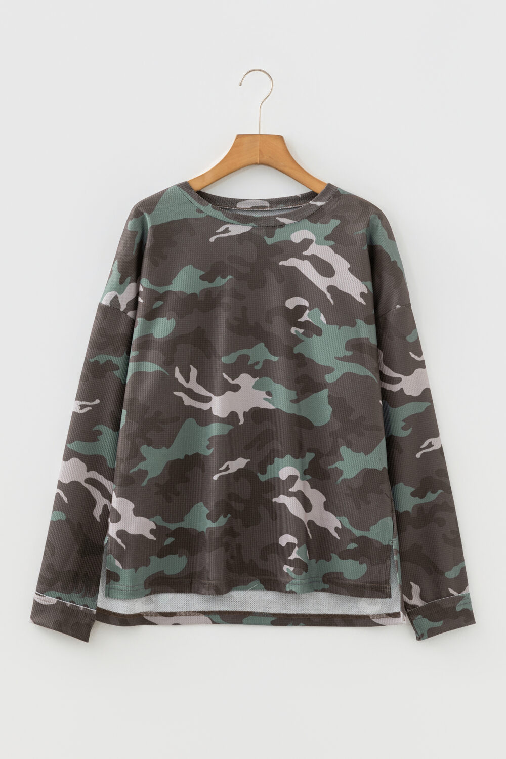 Green Camouflage Print Textured Drop Shoulder Long Sleeve Top
