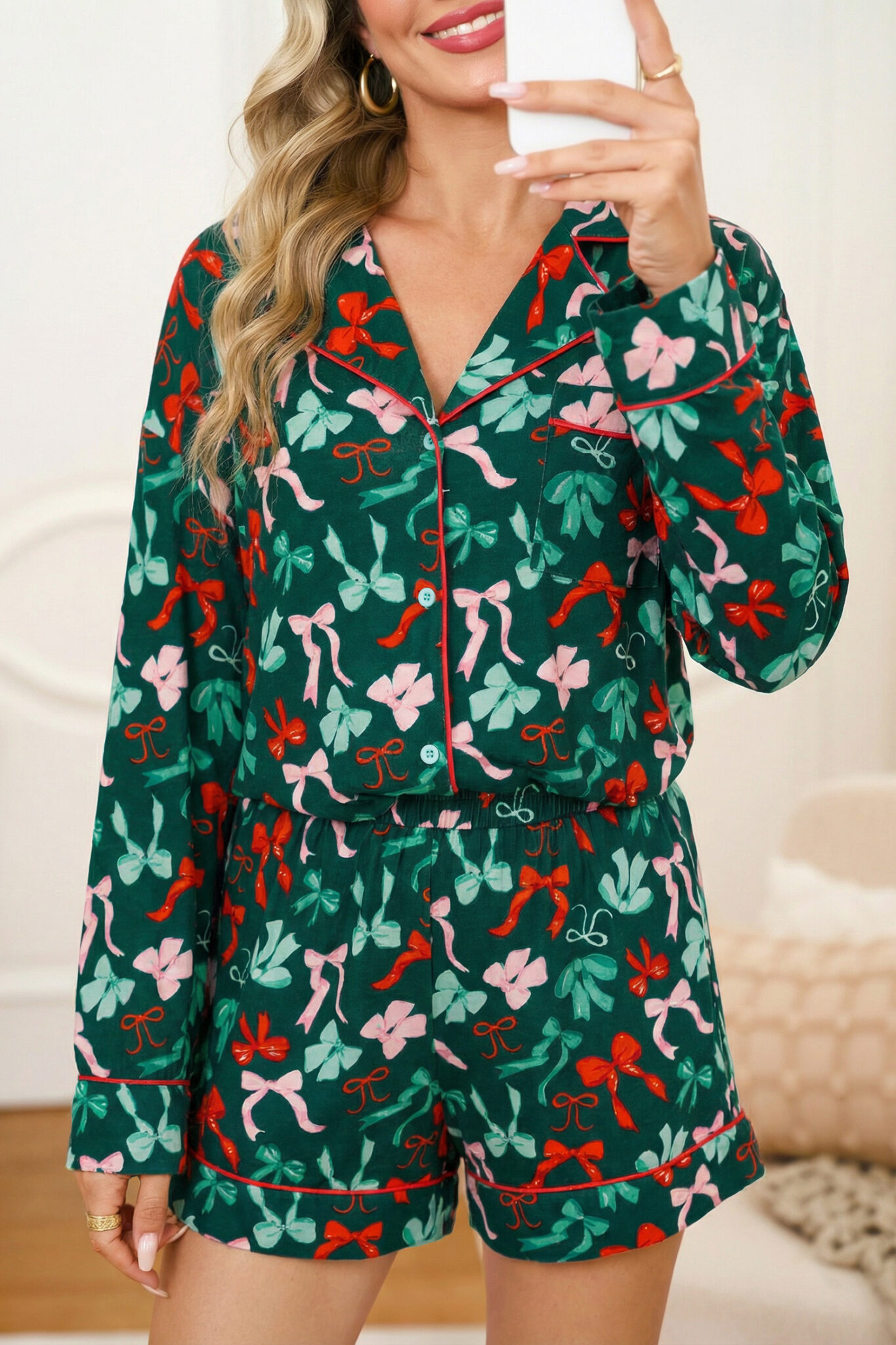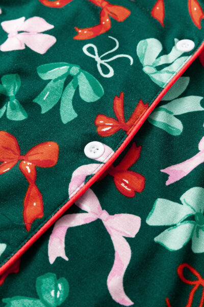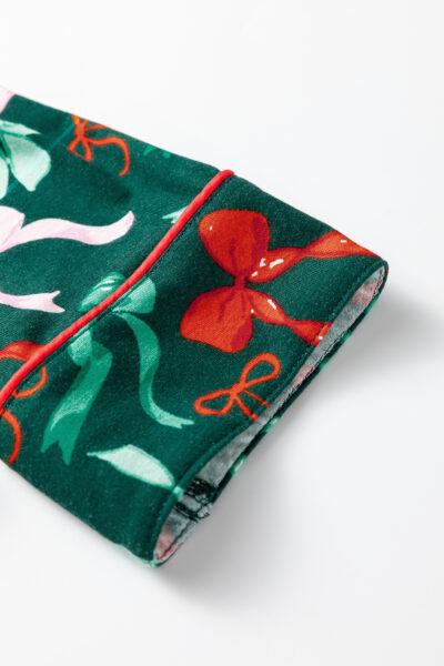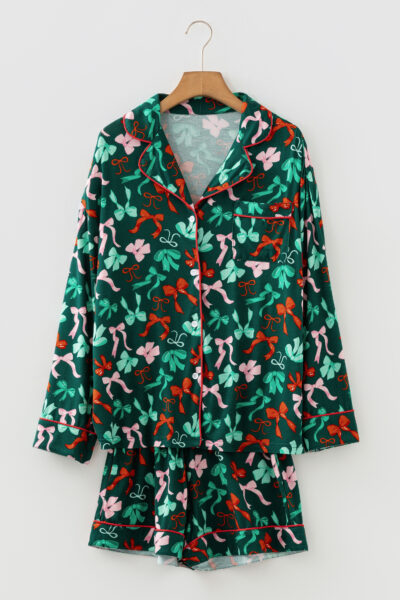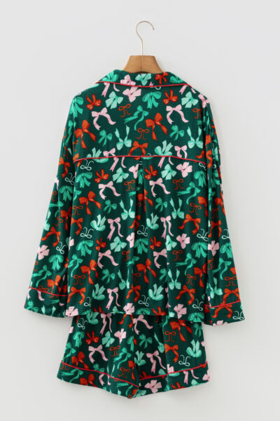 Green Festive Bow Print Long Sleeve Shirt and Pajama Short Set