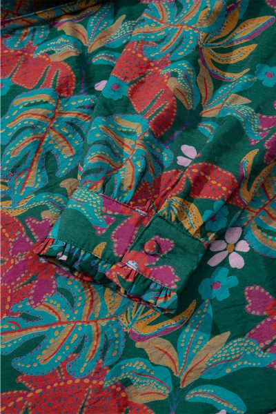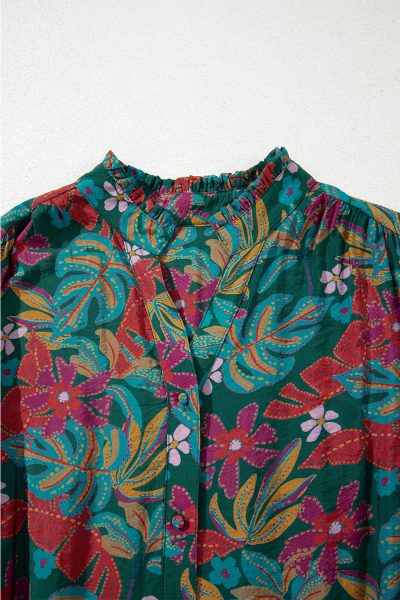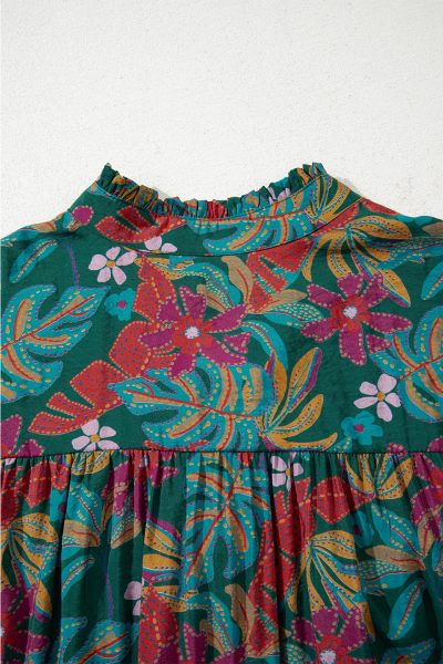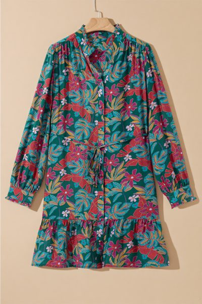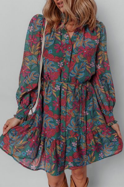 Green Floral Friled V Neck Puff Sleeve Ruffled Shirt Dress
